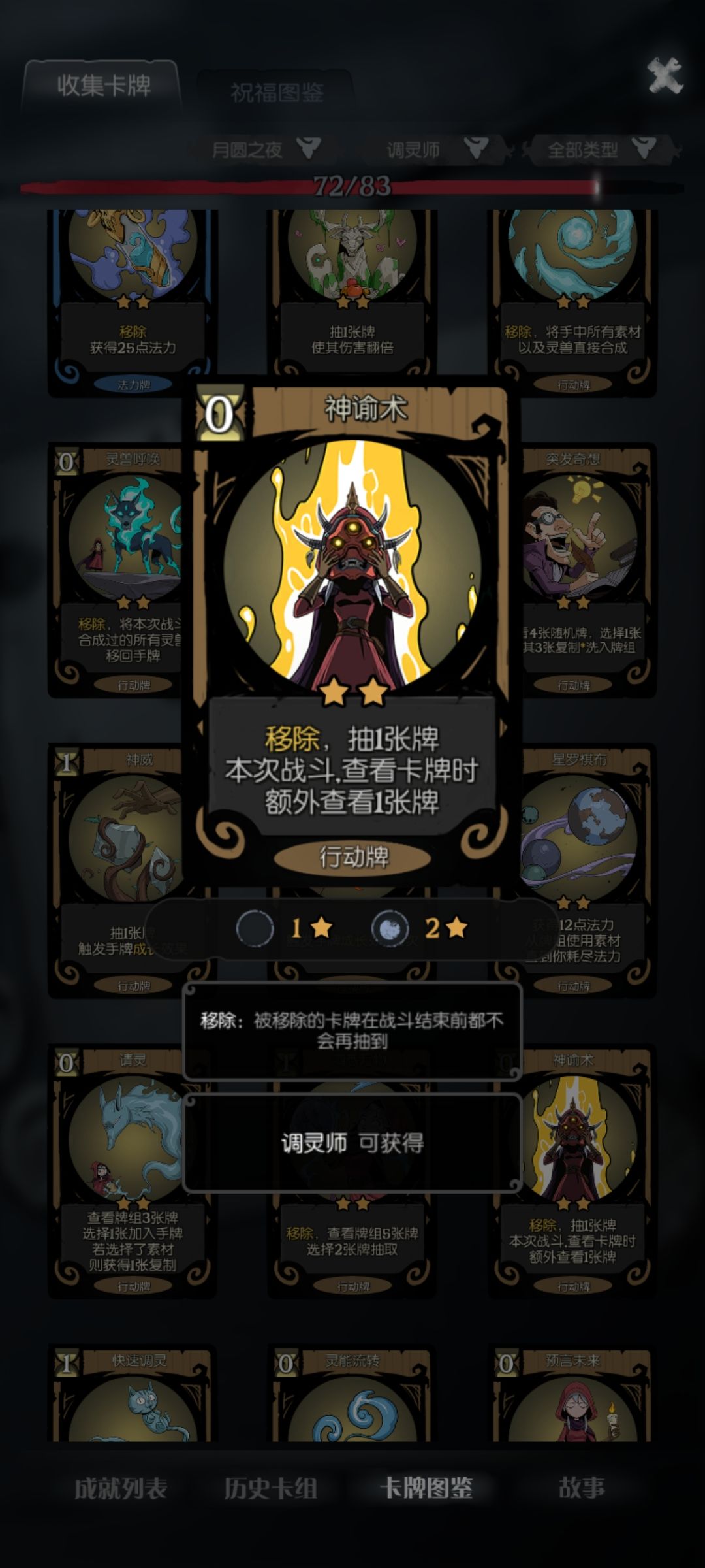 还有个人比较推荐的辅助卡:自然循环、神谕术、万物归一,尤其自然循环是真的好用,过牌而且可以把捕梦网、灵能流转和选择的素材删掉,保证每回合抽到拜火