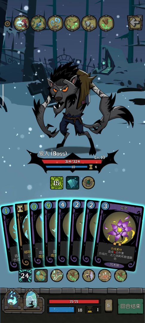 核心触发成长,前两回合依靠橡树之心的盾抗伤害,第三第四个回合依靠合成的卡牌输出,一般三到五个回合就结束。