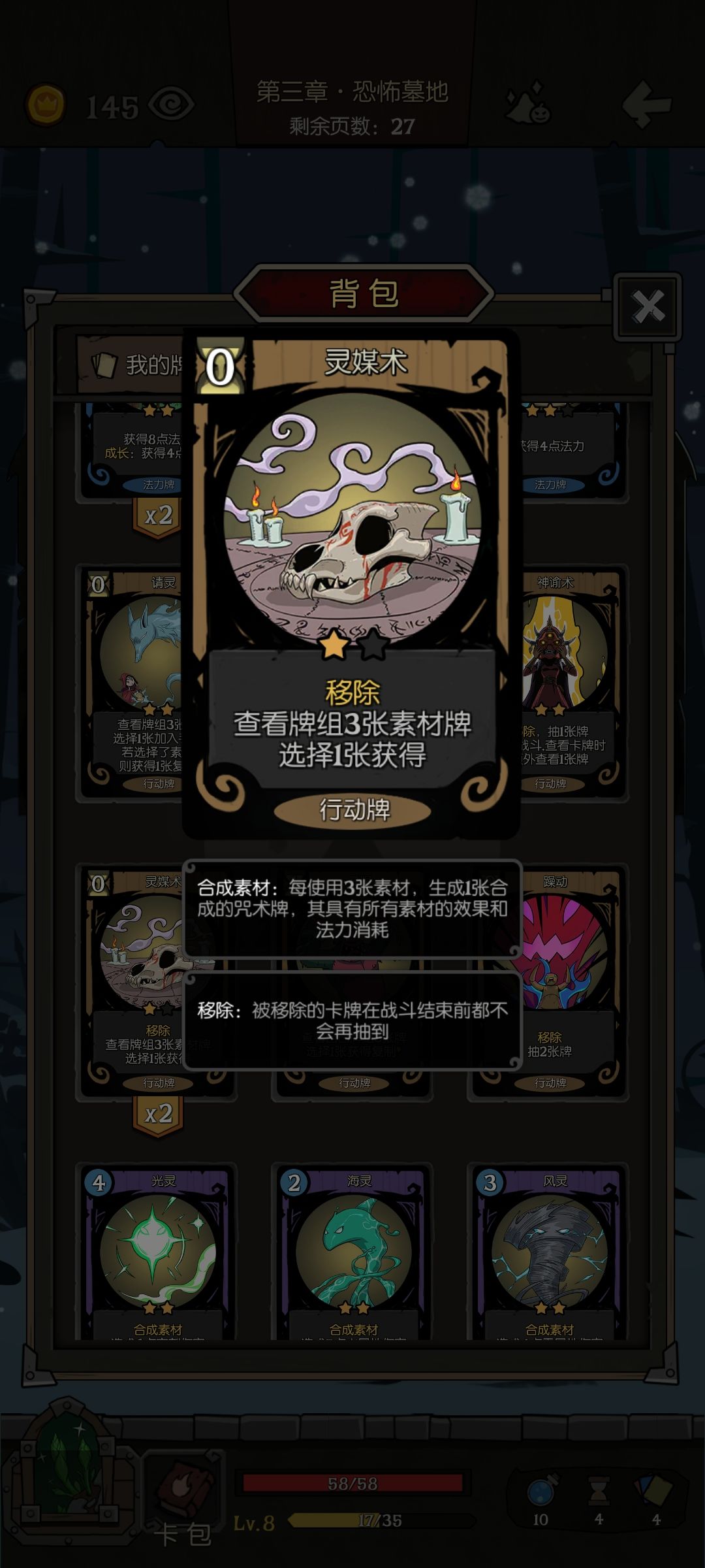游戏思路,开局先找风海光灵,强化满级,然后删掉所有其他灵。想永动需要伤害超过18,可以找增伤天赋,或者用往事书,往事书可以把查看的牌增加伤害,再拿一些查看牌组的牌,譬如灵媒术,洞悉万物,请灵,暴躁等,组件灵伤害增加最终合成的灵兽伤害也会同步增加伤害。调灵师技能灵活可以刷祝福商店,重置铁匠铺和忘忧酒馆,都可以帮助我们运营.如果找不到增伤带点回蓝牌即可。