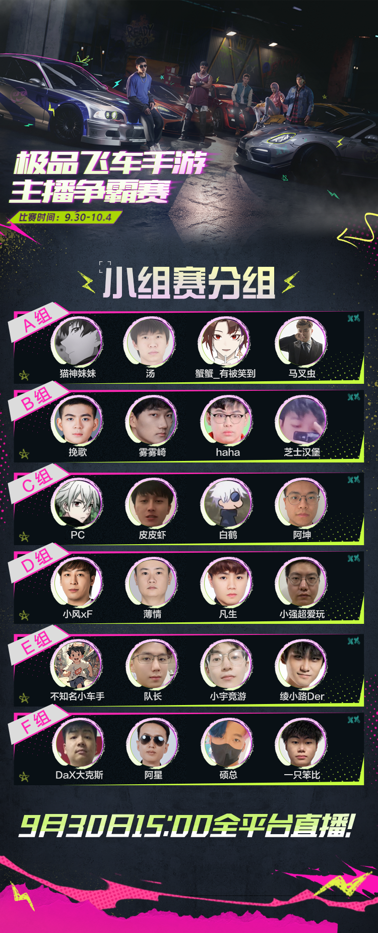 9月30日正式开赛!极品飞车手游主播争霸赛分组名单公布