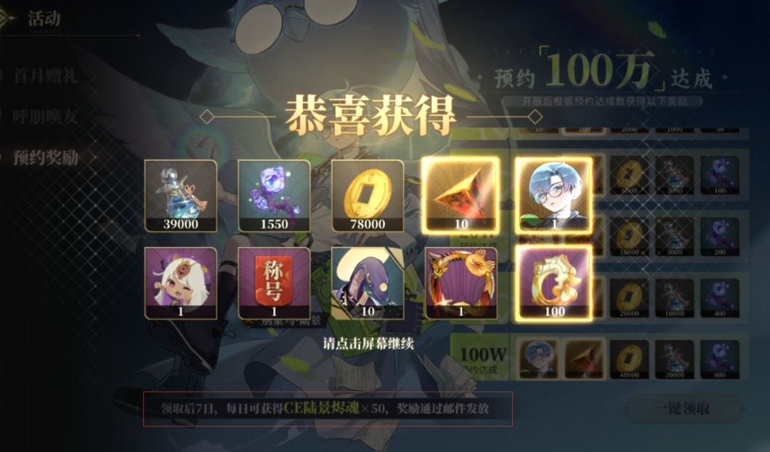 咱们继续,热门-预约奖励里还有丰厚奖励,除了镜心x10以外,还会赠送头像框和「别巢乌陆景」。注意,领取后7天,每天还能从邮件拿到陆景烬魂x50!