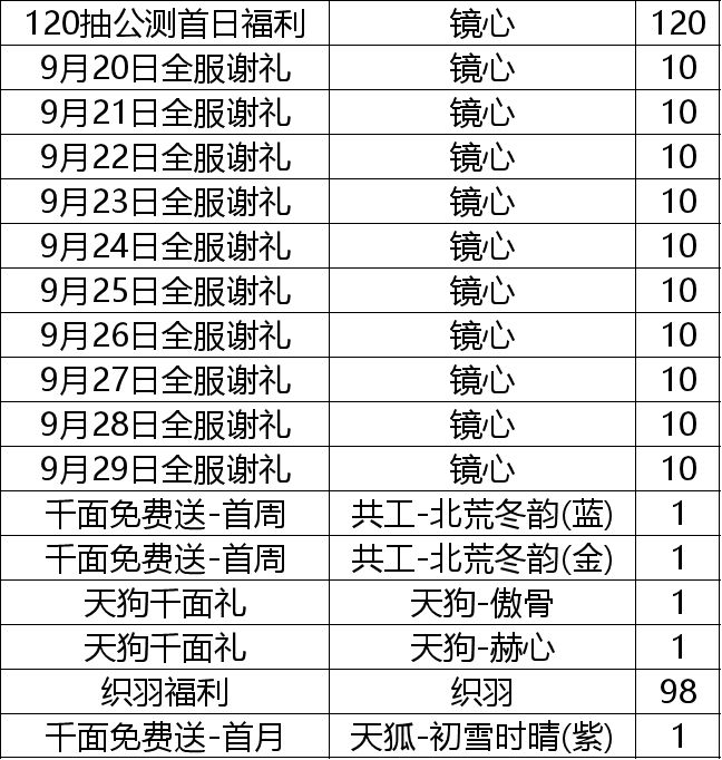 我角色到10级,从邮件里就可以拿到 镜心*220、千面丨共工-北荒冬韵(蓝)x1、千面丨共工-北荒冬韵(金)x1、千面丨天狗-傲骨x1、千面丨天狗-赫心x1、千面丨天狐-初雪时晴(紫)x1,以及可以用来购买千面的织羽98个。加上10级前剧情和历练拿到的,总共有镜心*225个!(千面就是大荒镜灵的时装)