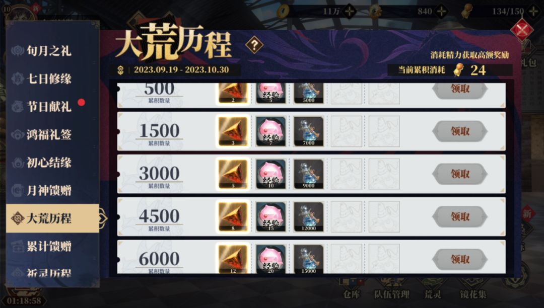 大荒历程中,对于我消耗的精力进行了记录,达到一定数量就能拿到镜心x30个,这就3个十连抽了。
