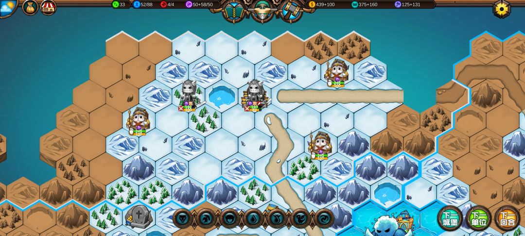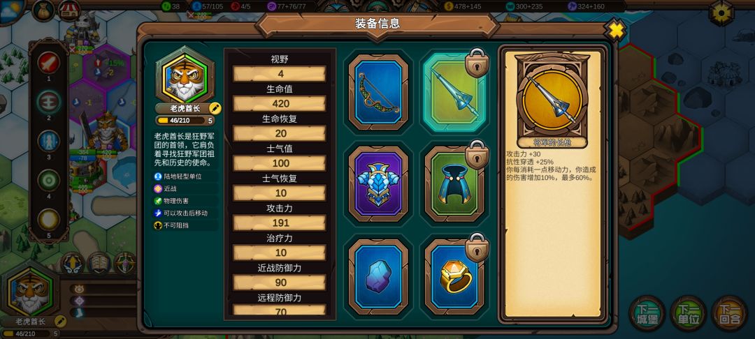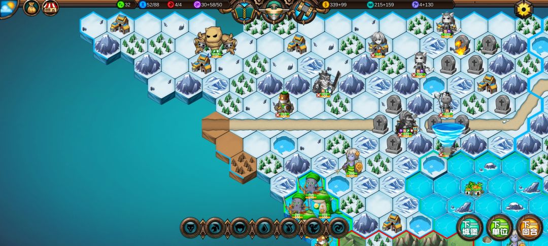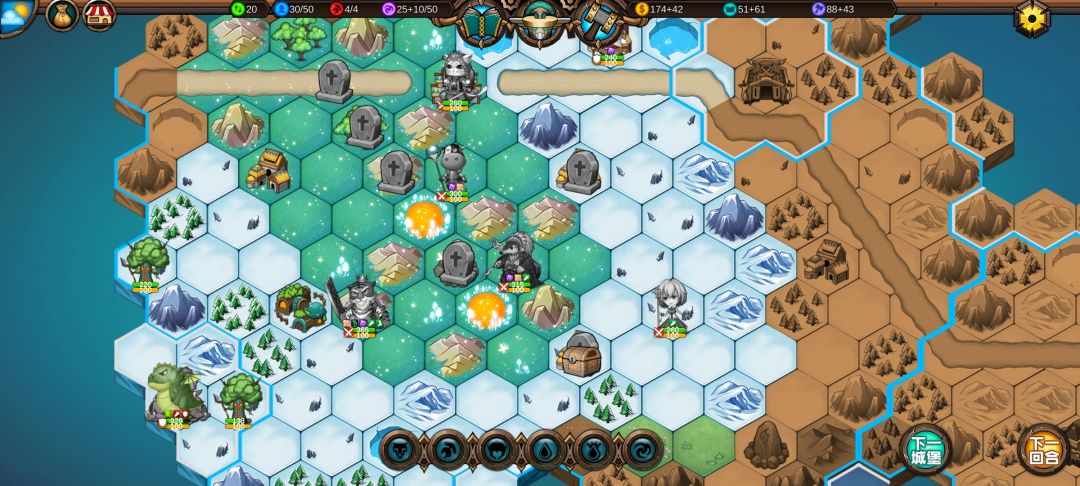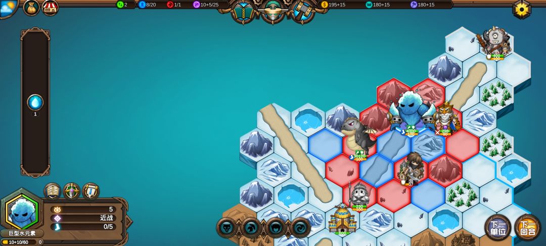 老虎挡住中立怪巨型水元素,让它只能向下走,这样下回合就能打到右上角的守城怪了
