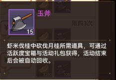 如题顾名思义,该活动在时限内产出专属道具-“玉斧”,玩家使用斧头,去砍伐月桂树,获得道具“月桂”和“太阴石”。