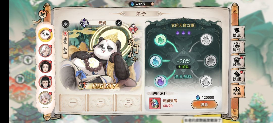 前期阵容奶妈还是有必要带一个,后期有功法,法宝加持根据对手酌情考虑,常规搭一肉一奶三输出够用,多数弟子有怪癖(属性好坏参半),没解锁律法堂前无法消除(有道具但不好获取),搭配时也要考虑。除了提升境界之外,天命也能很大程度提升弟子基础属性。