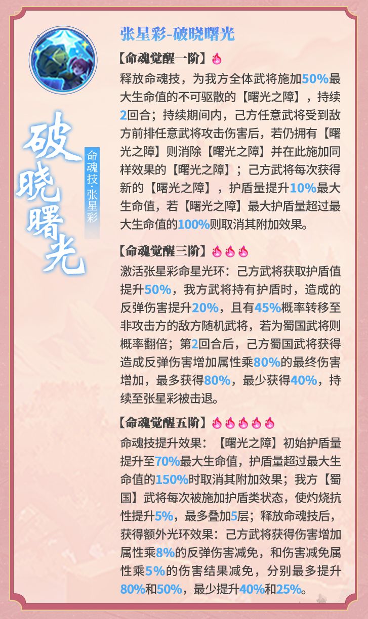 一是让主动命魂技施加的“曙光之障”具有更高的上限,同时更不容易被击破,更加稳定。二是进一步增加我方全体获取护盾的收益,让其直接抵消伤害的同时,还能针对一下慢速抗队比较畏惧的灼烧伤害。三是释放主动命魂技后,大幅度提升我方全体的坦度,给予两种抗性属性:受到反弹伤害降低,以及珍贵的伤害结果减免,更加出色的属性是伤害结果减免,最高能增加50%点,要知道曾经以一己之力彻底改变整个环境的方圆阵点满之后才能增加30%-60%伤害结果减免,还有回合限制!命魂觉醒后的张星彩一个被动效果就远超曾经一整个阵法的效果,强度相当可观。