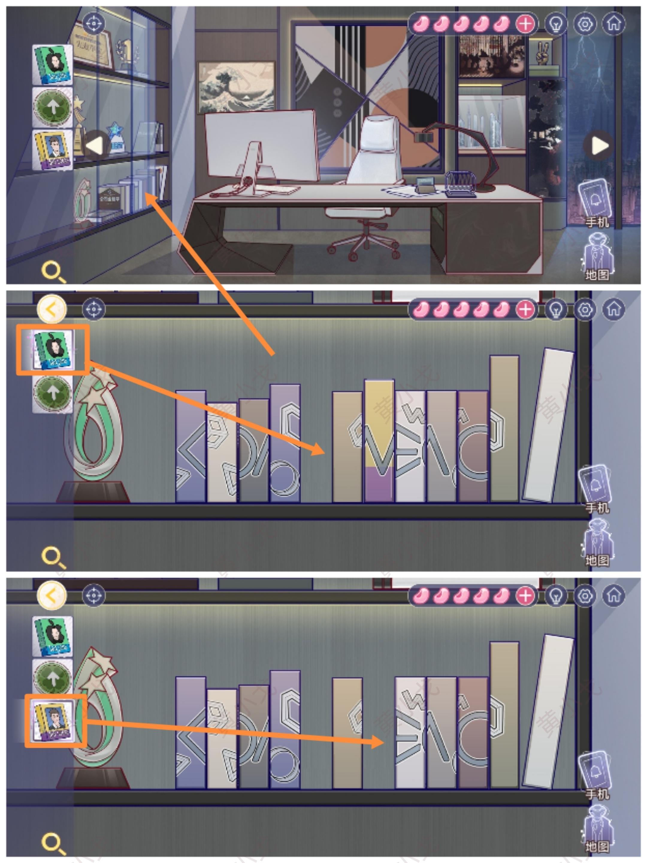 26.(办公室-办公桌)点击右侧的玻璃柜,根据茶杯底座上图案的位置,把对应的模型放到正确的位置上