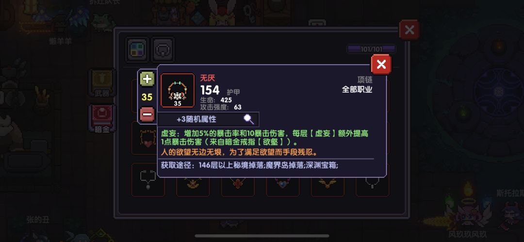 上述是比较常规的带法,还有一个不太常规的带法。盔头选择老花镜(暴击值低于300的时候提升50爆伤),项链选择无厌,舍弃暴击值洗穿透属攻爆伤,戒指还是赌狗,舍弃暴击值洗穿透属攻爆伤,衣服选择鬼袍,鞋子还是宝石鞋,披风还是吞蓝。无厌提供5%暴击率,鬼袍提供10%暴击率,大师提供10%暴击率,战士辅助提供5%暴击率,人物只需要274暴击值就能达到100%暴击率,仙王武器提供一个暴击+鬼袍提供暴击,配合魂卡的恶魔羁绊,凑到274是十分简单的。这个搭配比较常规搭配能有大约1.5%的最终伤害提升。但是依赖战士的辅助和鬼袍效果的触发,仁者见仁,智者见智。