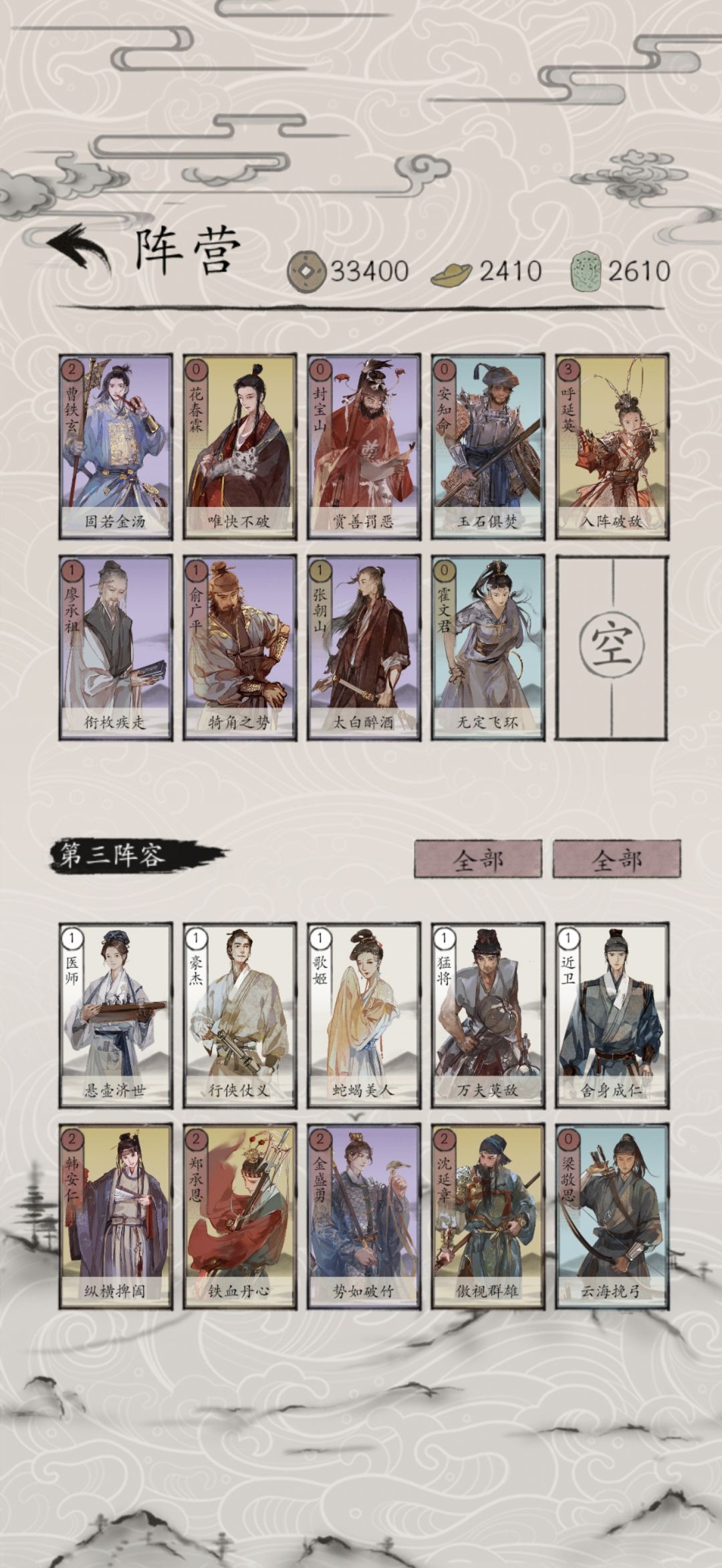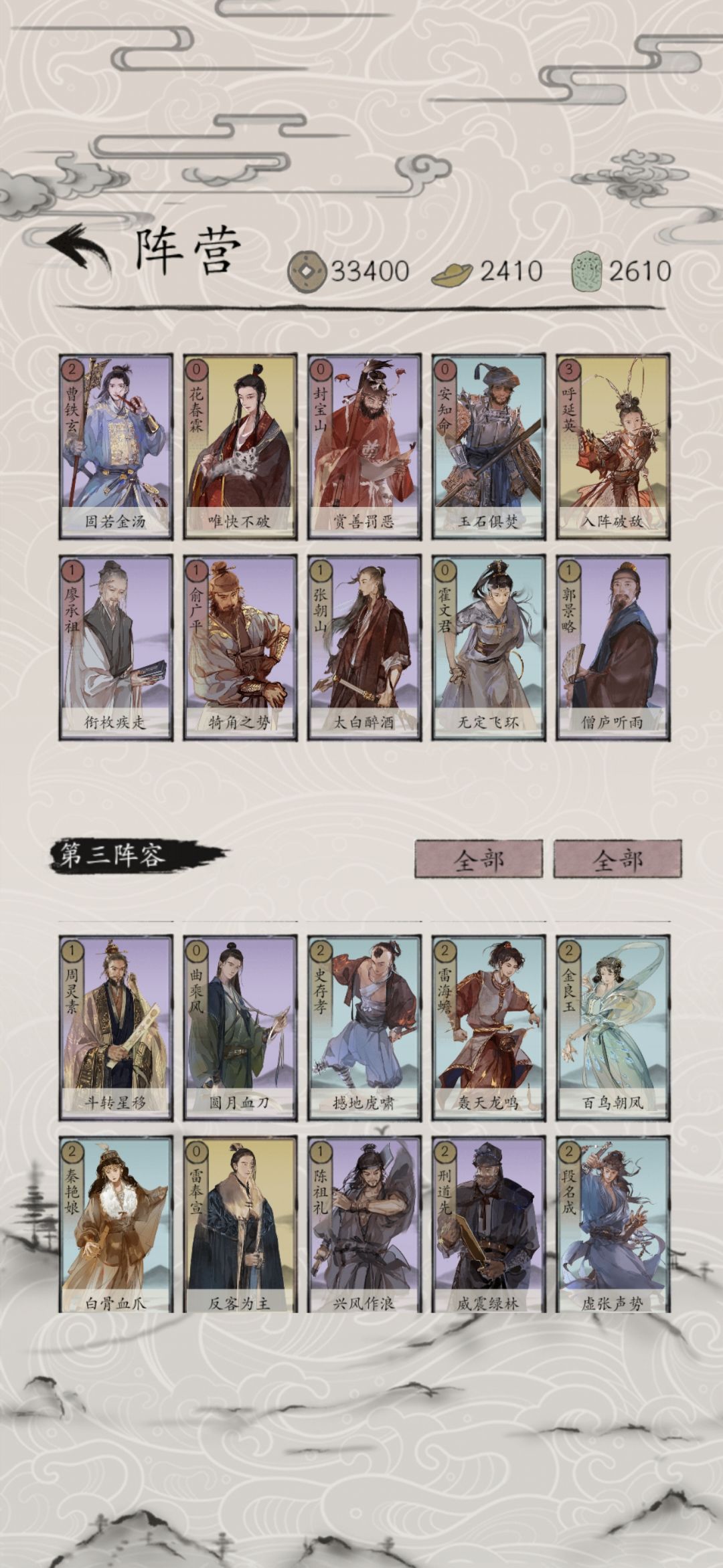 4、对战武林,武林可以说建文的天敌,所以我一开始就推荐携带郭景略,否则支援建文的机会不打。这个对局一定要沉住气只能依靠支援打节奏,不要想着调将速胜这个概率很小不要把小概率事件当成必然。安知命在这里就比较灵活了正常是移除李望仙,少部分情况也有移除陈逸云或者诸葛洪英的这个看情况而定。