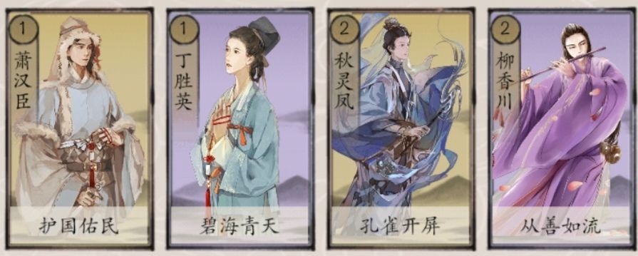 呼延英和支援两人组就不解释了,卡组核心无需多言。曹铁玄主要是为了增加卡组的下限,在呼延英沉底的情况下我们可以快速打光手牌依靠曹铁玄的调将技能继续与对方周旋。封保山、花春霖和安知命则是万金油朴实无华的强。霍文君主要是为了配合俞广平吸取费用提高上限(如果环境不适用可以换成郭景略或者丁胜英),同时内战和对战永乐时也有机会破掉对面的护主,属于一卡两用。而张潮山则是环境卡主要针对环境中的回血卡牌同时也有破护主的功能主打一个费低好用。最后还有一张机动卡位,想增加后手的机动能力可以带萧汉臣或者丁胜英,针对藩王可以带秋灵凤,对抗流血埋伏则可以带柳香川,