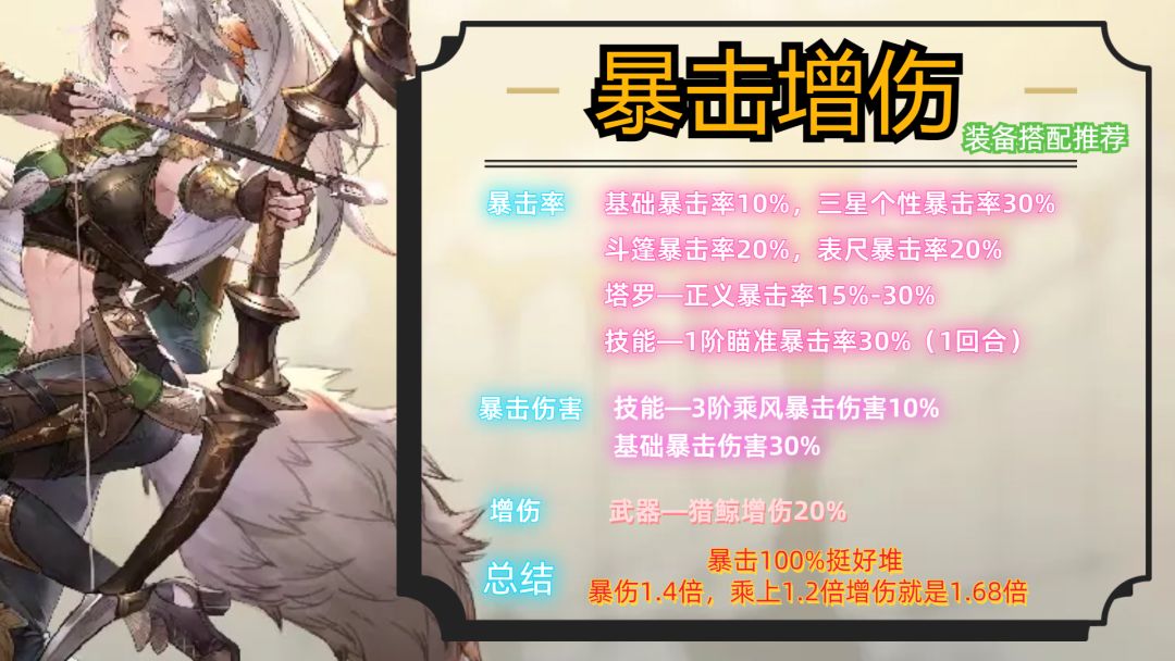 4, 暴击增伤:暴击100%好弄,基础暴击率10%,三星个性暴击率30%,斗篷暴击率20%,表尺暴击率20%,塔罗—正义暴击率15%-30%,技能—1阶瞄准暴击率30%(1回合);