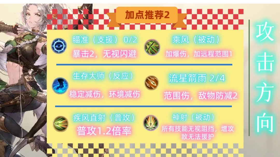 攻击方向,瞄准+乘风+生存大师+流星箭雨+疾风直射+神射。