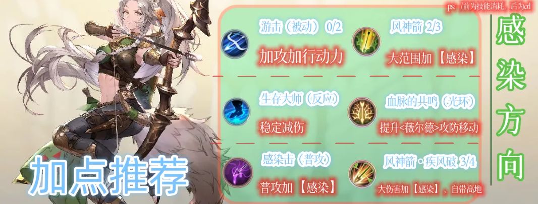 5, 技能加点:感染方向,游击+风神箭+生存大师+血脉的共鸣+感染击+风神箭•疾风破;
