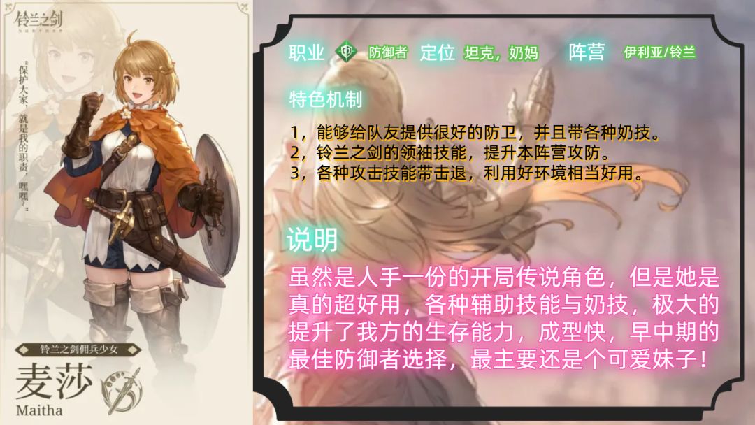 4, 麦莎:虽然是人手一份的开局传说角色,但是她是真的超好用,各种辅助技能与奶技,极大的提升了我方的生存能力,成型快,早中期的最佳防御者选择,最主要还是个可爱妹子!