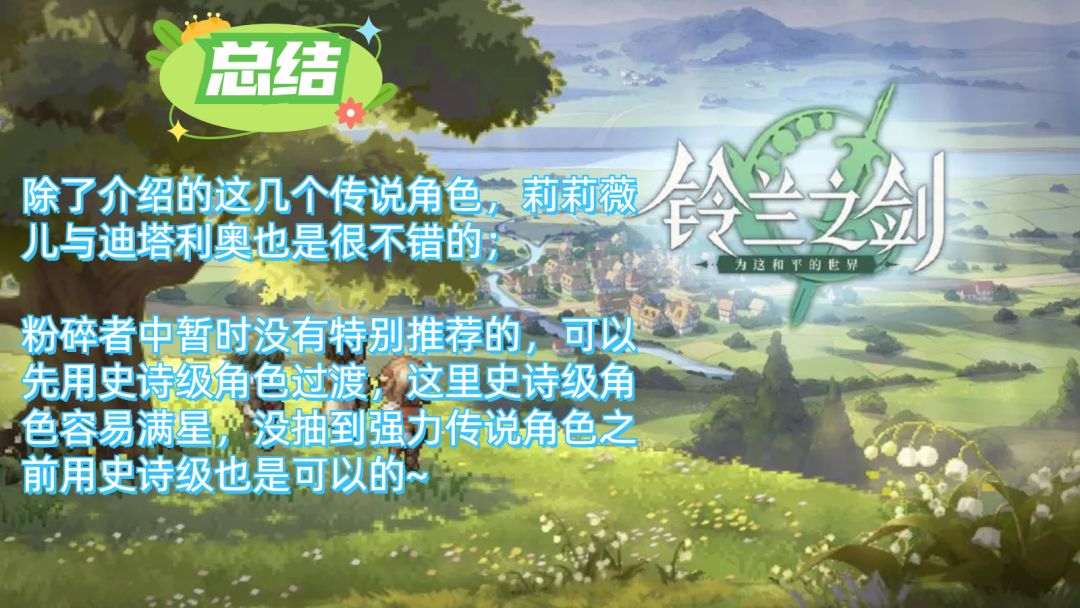 6, 总结:除了介绍的这几个传说角色,莉莉薇儿与迪塔利奥也是很不错的; 粉碎者中暂时没有特别推荐的,可以先用史诗级角色过渡,这里史诗级角色容易满星,没抽到强力传说角色之前用史诗级也是可以的~