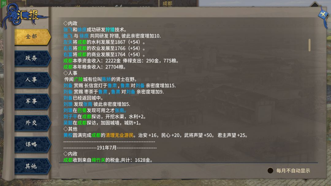 怎么样,士兵多吧?怎么养各位应该猜到了,没错,就是抢。犍为一次8万粮3万钱,锦竹关一次5万粮1万钱,这会千万别想着守城,麒麟儿还没出仕,你人才不够。情报一定要最高档