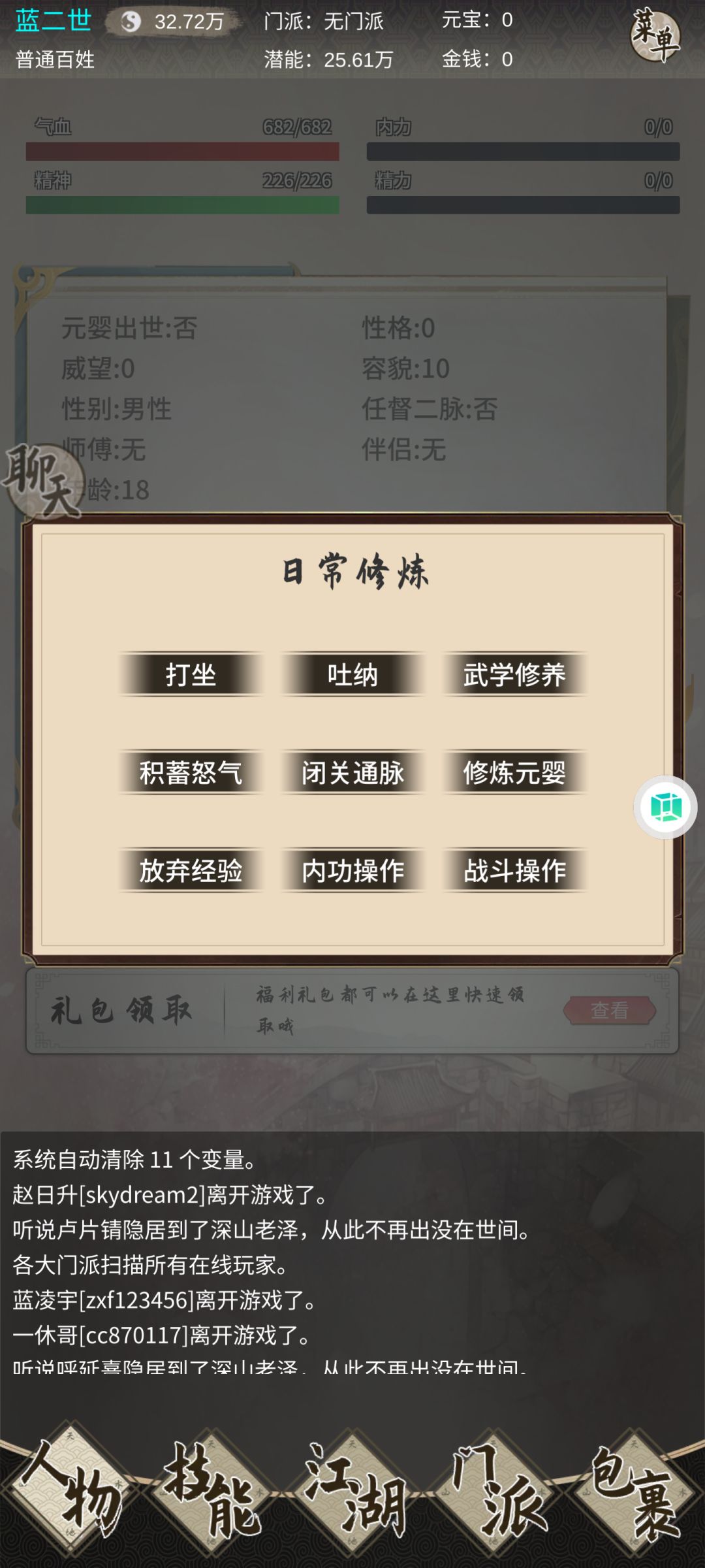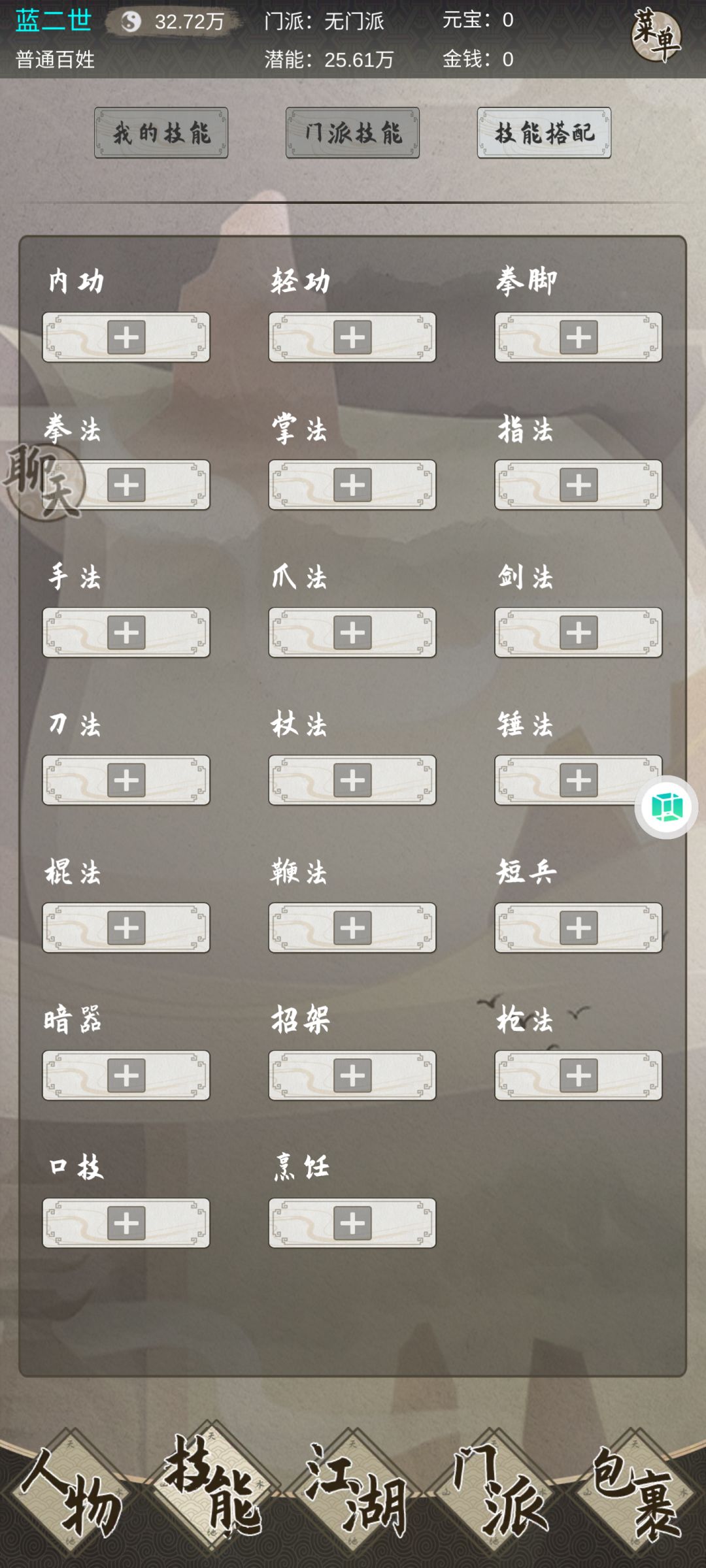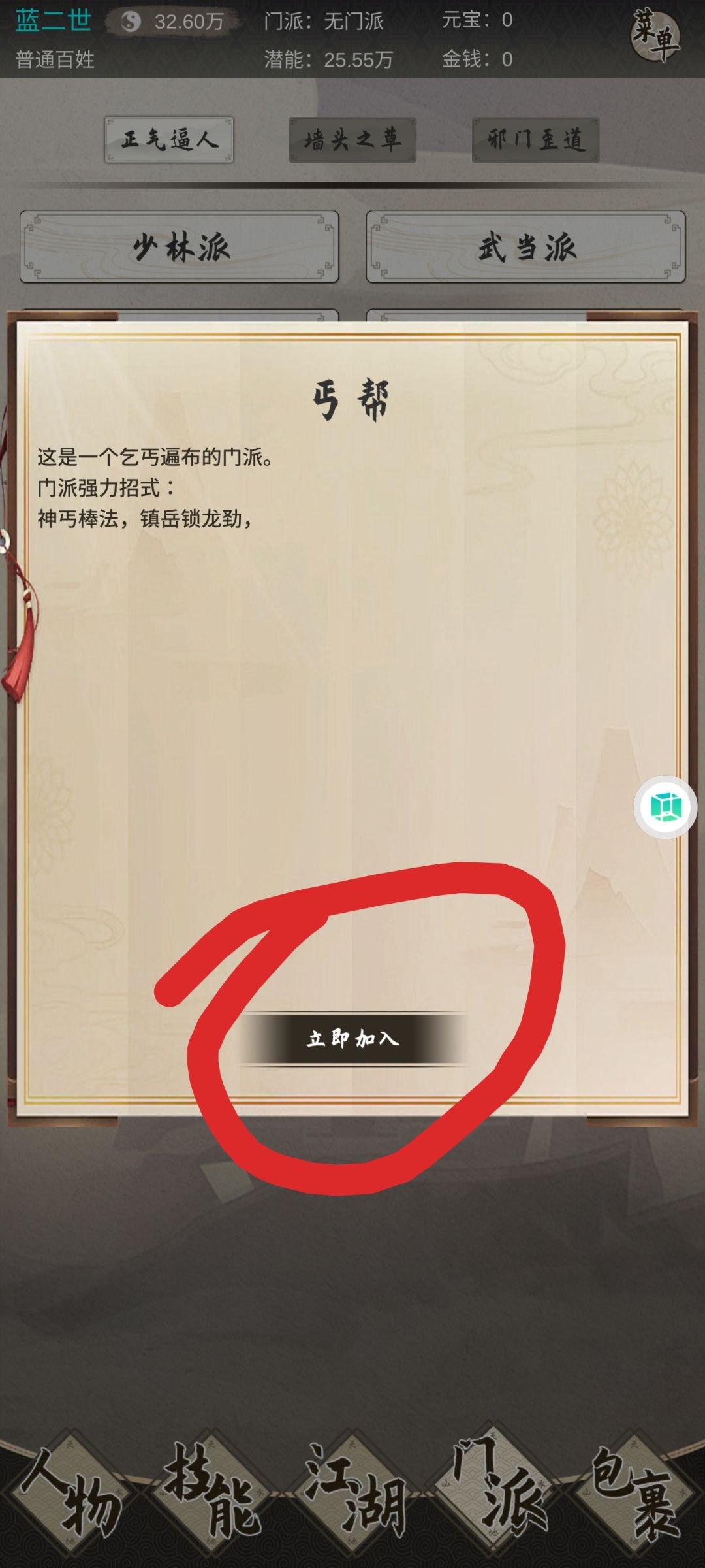 然后就可以点击日常活动进行打鸟了,前期潜能获取方式巨缺无比,而获取潜能渠道只有打鸟任务(可在武庙离线挂机,实战经验100w以内可以获取奖励)、师门(师门100w经验内,可以用赠送的野球拳,胡搅蛮缠技能的可以秒师门怪的,记得技能-技能搭配,装备上)、赞助,可根据自己的玩法来进行实战经验的控制,如果你想咸鱼可以一直放弃经验(在人物练功处可以放弃经验)在一直打鸟攒潜能,前往钱庄可以存潜能只要花费10银币)。然后选择自己想玩的门派,在门派处一键入门就可以。推荐玩丐帮,上手简单,伤害也可以,比较适合新手。
