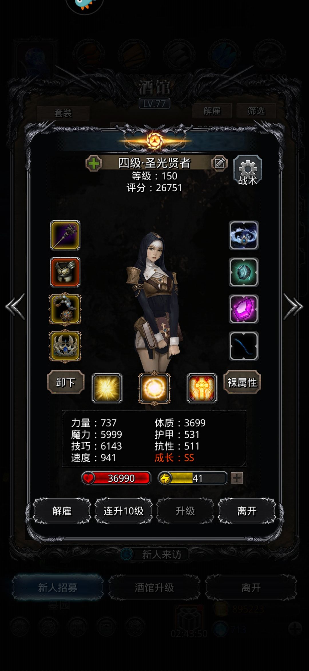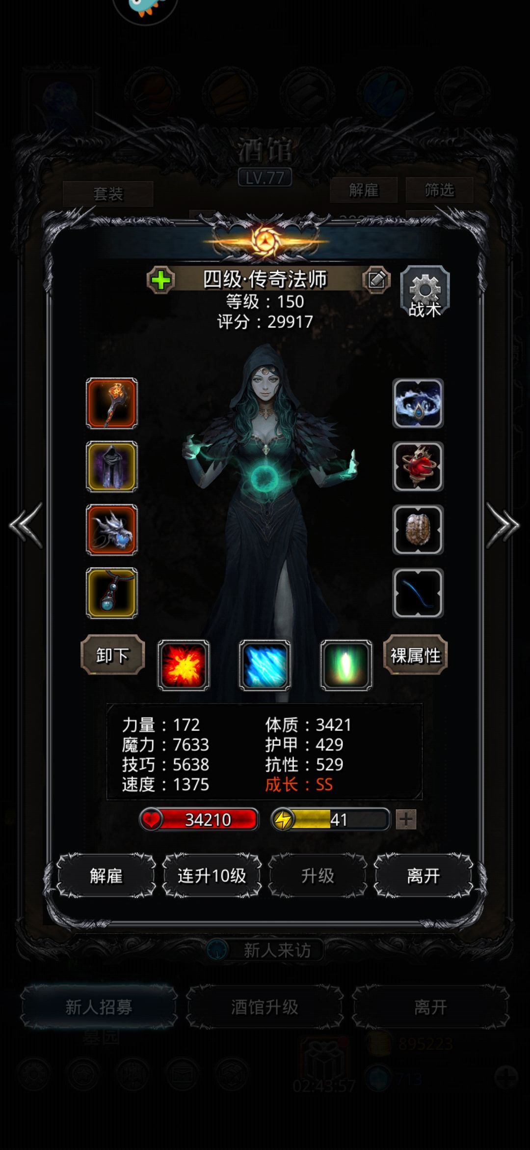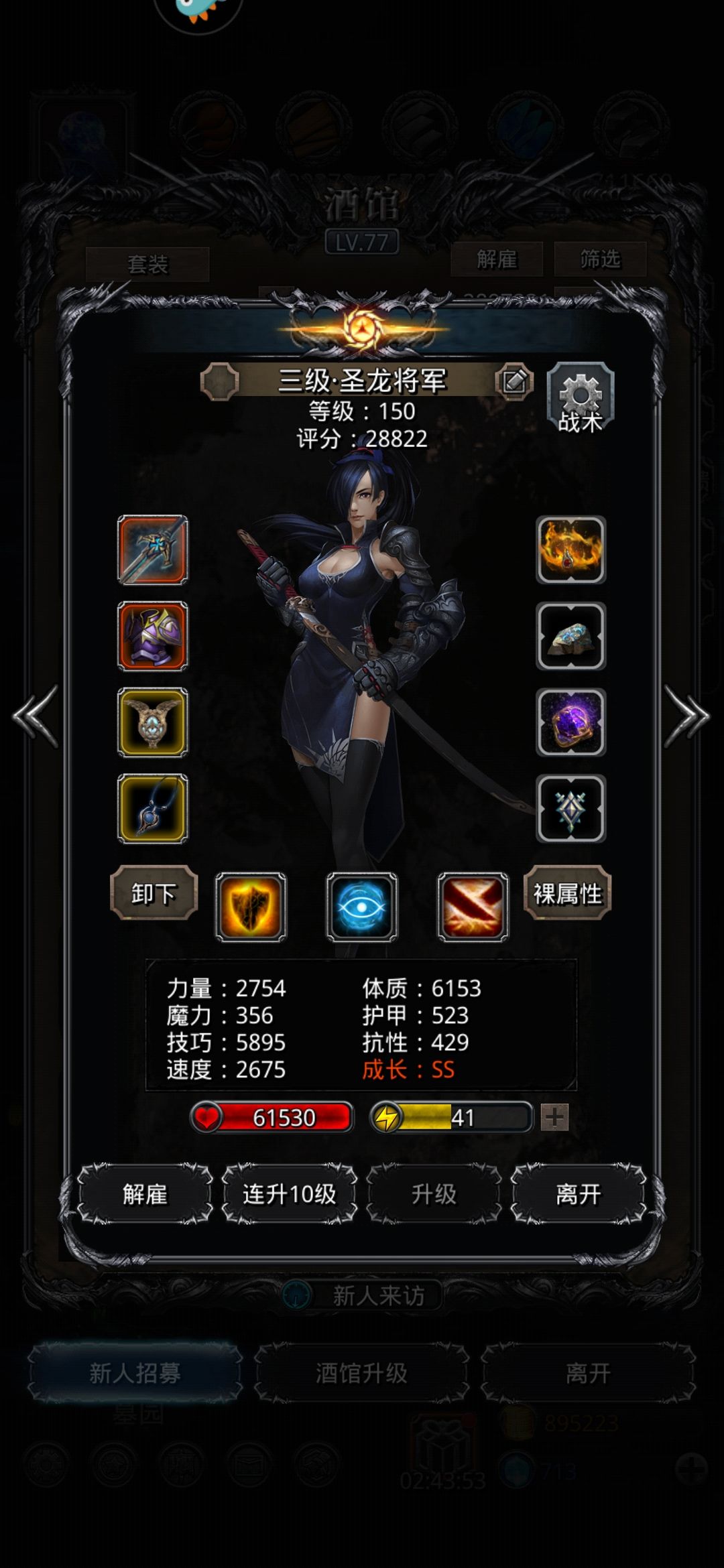 低配还是圣龙大法好,就是算抗性算得脑阔疼,正确方法应该是先堆统领和传法的技巧,确定两人提供的总技巧,然后根据情况调整祭祀的技巧,6w血的圣龙抗性控制在5059以上,1分51打完,感觉5080抗性问题应该都不大,然后算算其他人不能受到致死伤害。