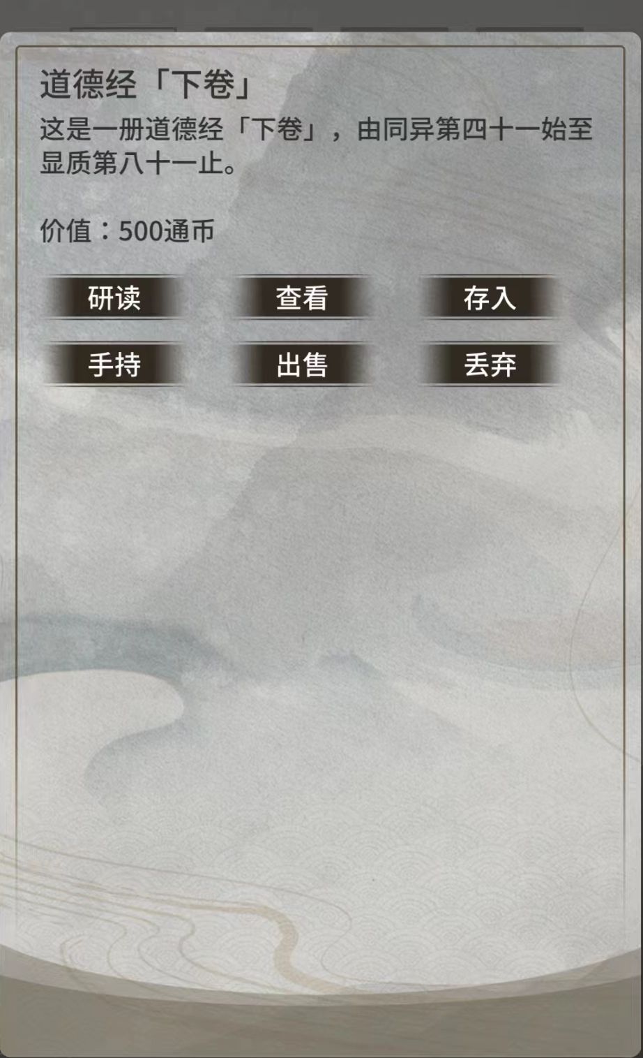 道学心法可以先从清虚道长和谷虚道长那里分别拿到道德经的上下卷,包裹中点击进行研读。见图4 。上卷提升道学心法0-50级,下卷提升道学心法50-100级。提升的等级已经包含武当藏经阁里的其他书籍(0-30),读上下卷就够。