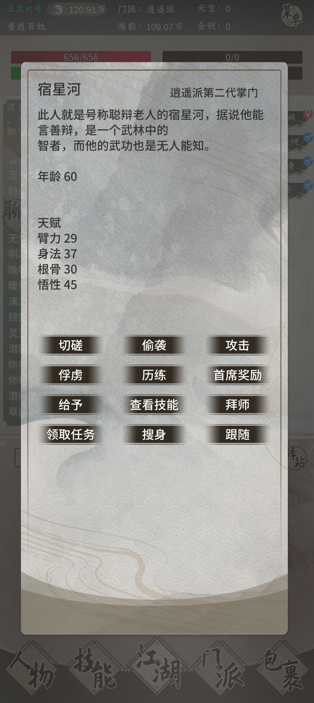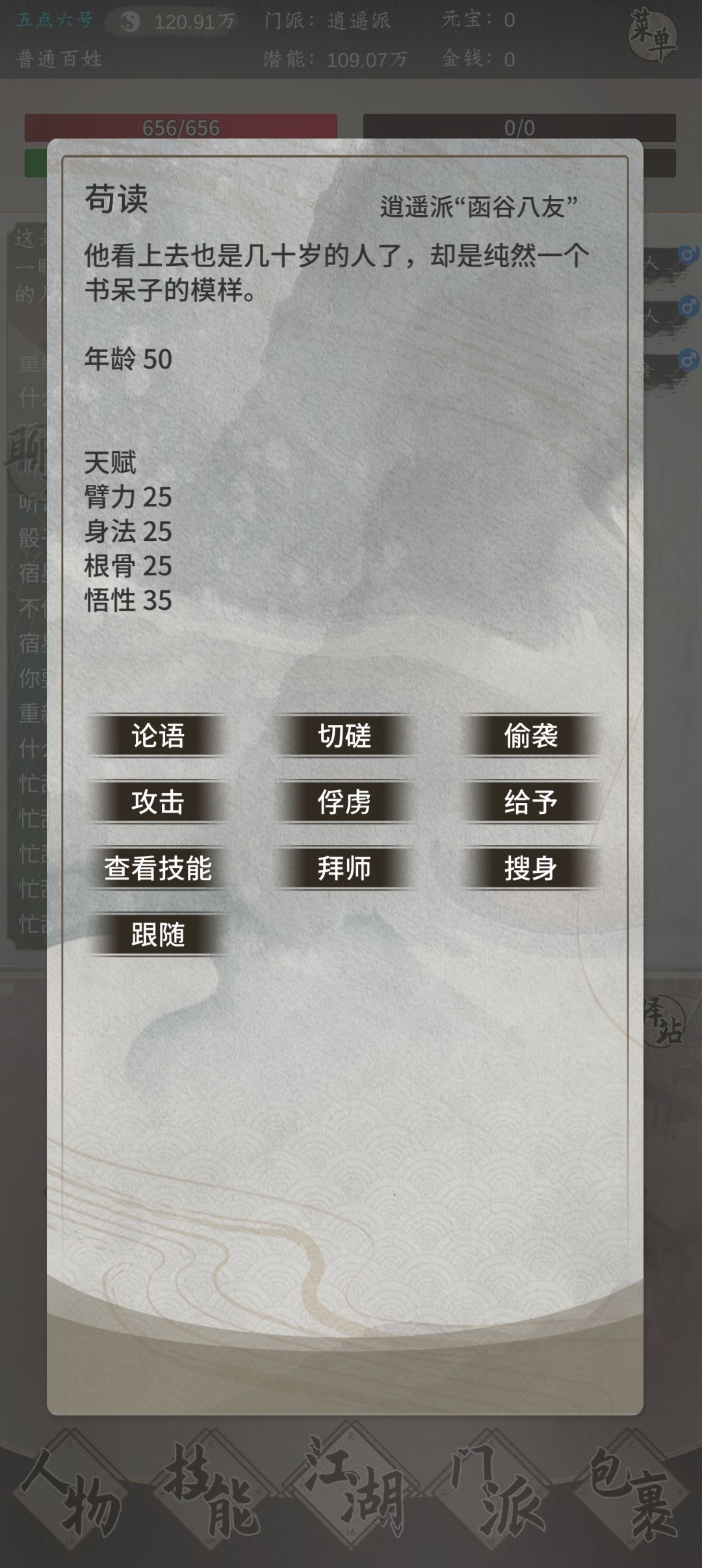 前期的我们潜能十分缺少,如果想省的潜能,我们可以在康江陵处拿棋谱研读,苟读处拿论语。棋谱可以提升基本手法到30级,论语将读书等级从100提升到120级。
