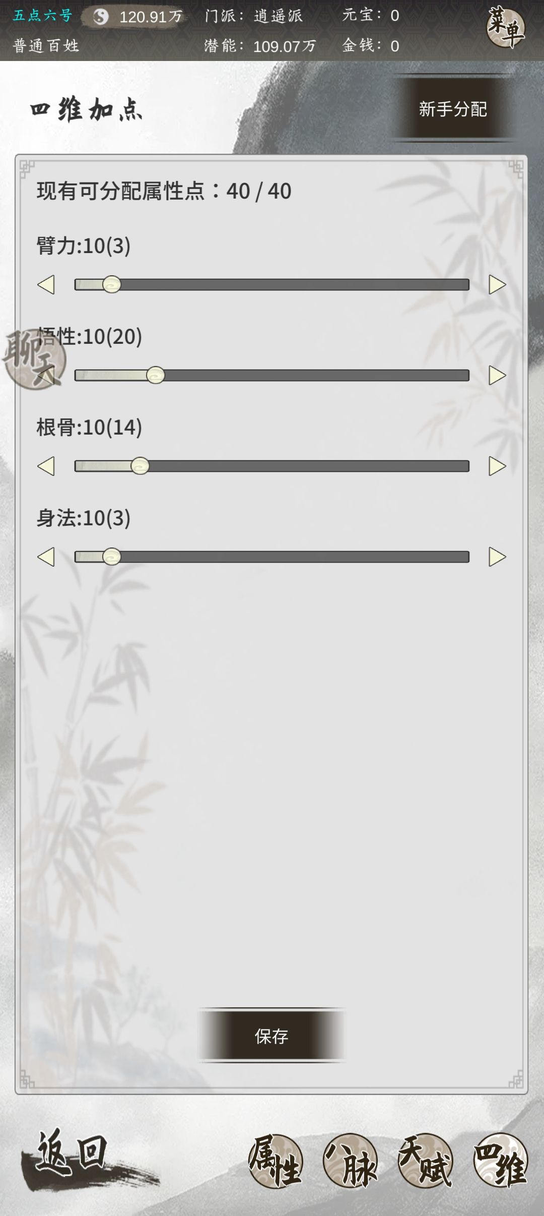 四维:高悟性加点,13 30 24 13,将仙丹吃满,悟性大于等于32,根骨大于等于24。