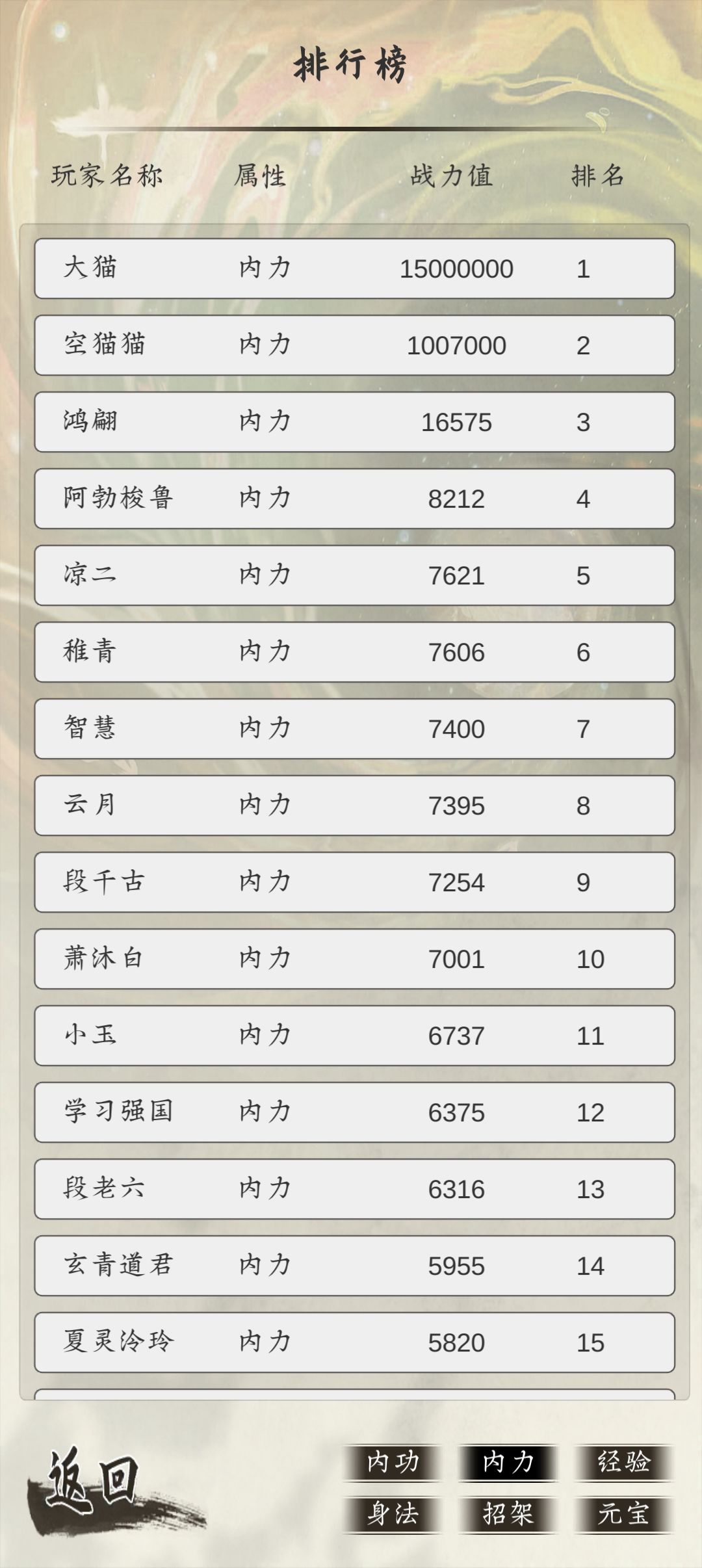游戏内力排行榜截图