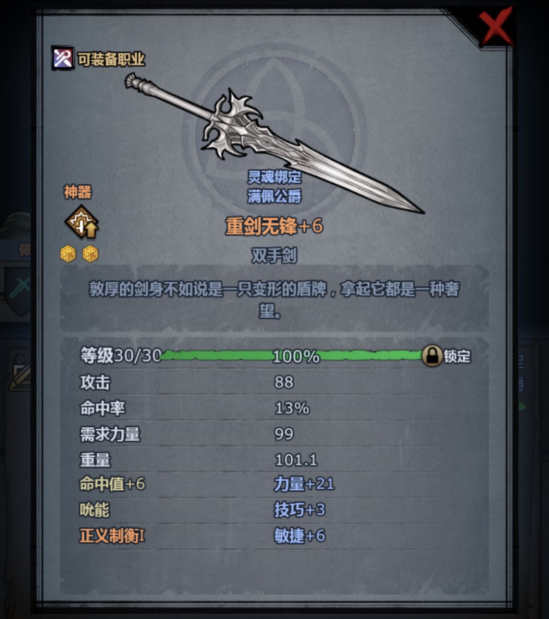 *加强过一次,现在自带+1移动力,触发条件简单,实用性很高,日常用偏斜+招架双修大剑士也能玩得很舒服。(古老流派圣剑士的最后一块拼图)