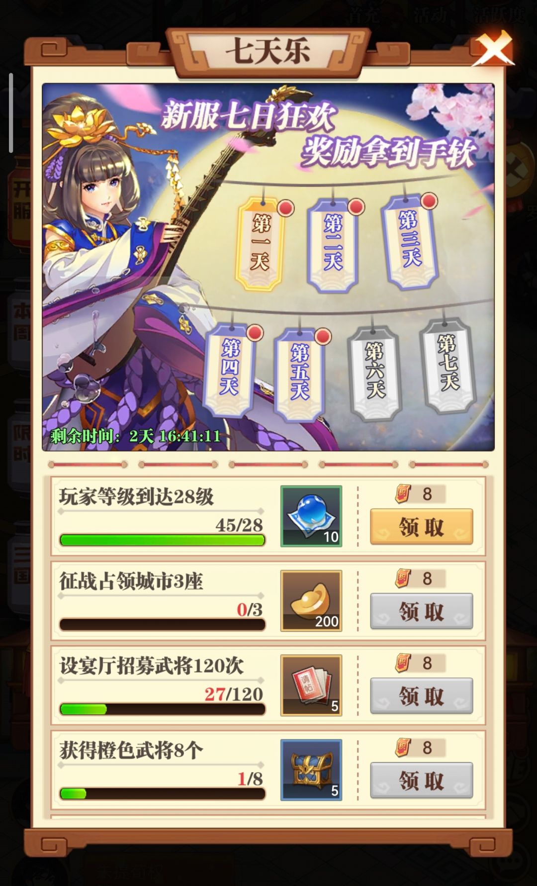 领取途径:12级完成对应主线任务解锁活动后,游戏内右上角 - 活动 - 三国福利 - 七日登陆