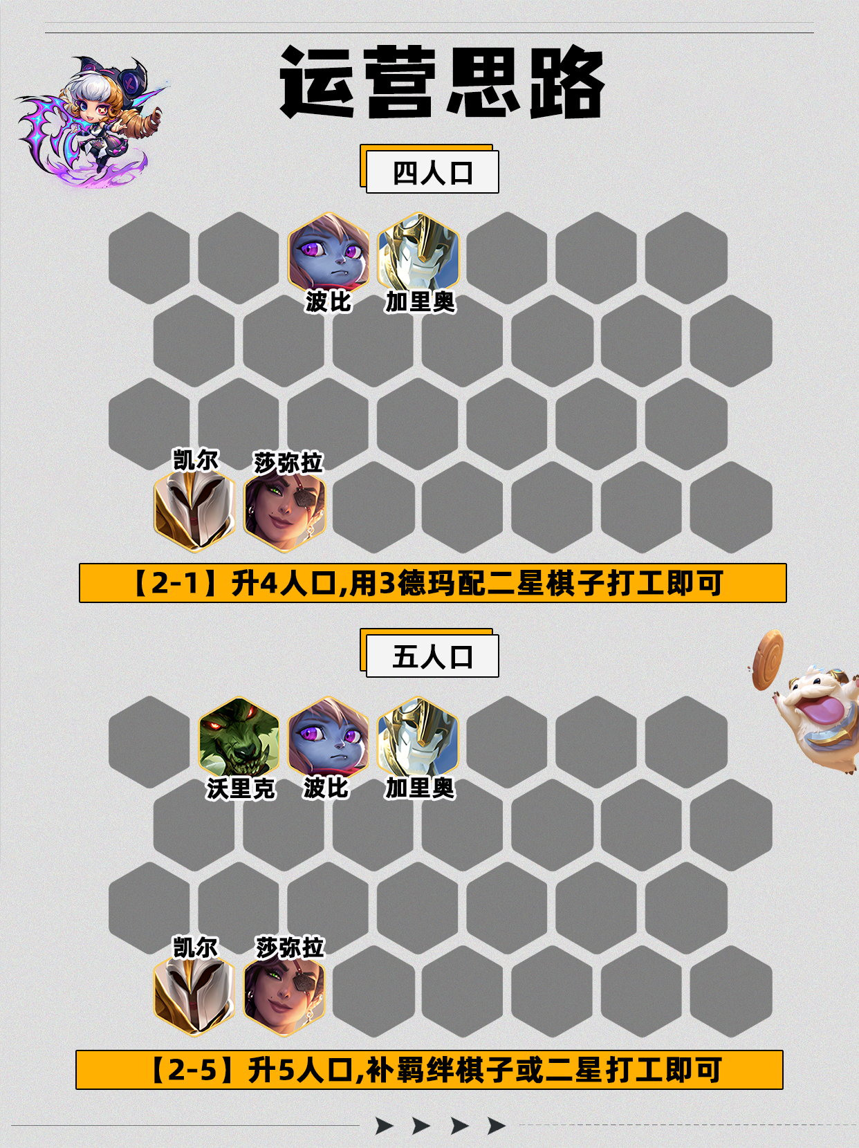 🔴【2-1】升4人口,用3德玛配羁绊或二星棋子打工即可