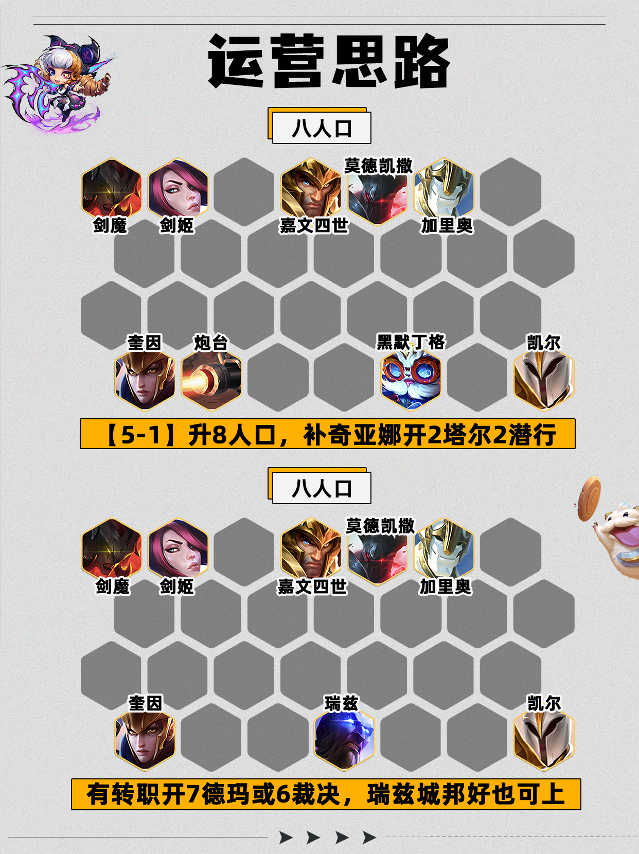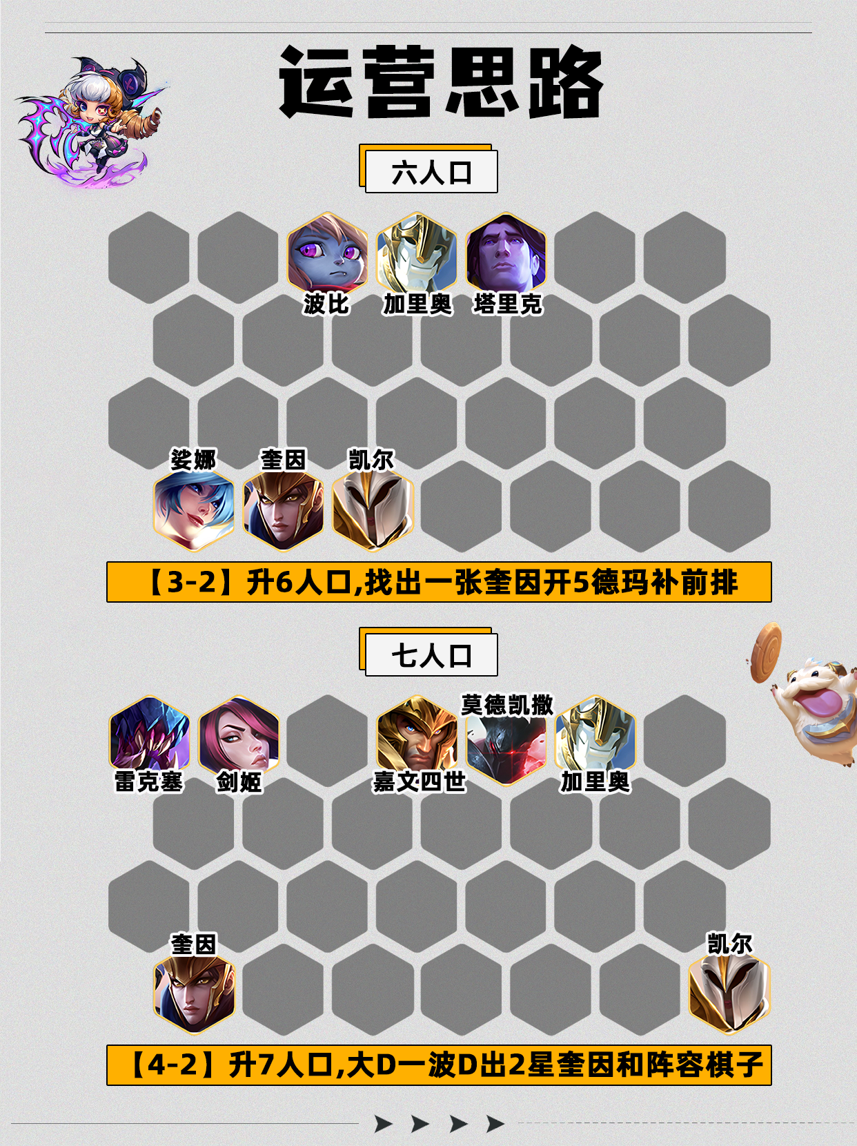 🟠奎因三星后升8人口,五费卡替换阵容低费卡,有转职开7德玛或6裁决,瑞兹城邦效果好也可上