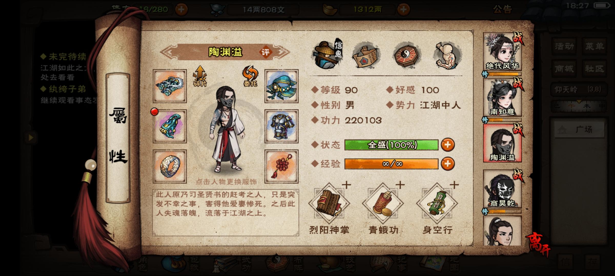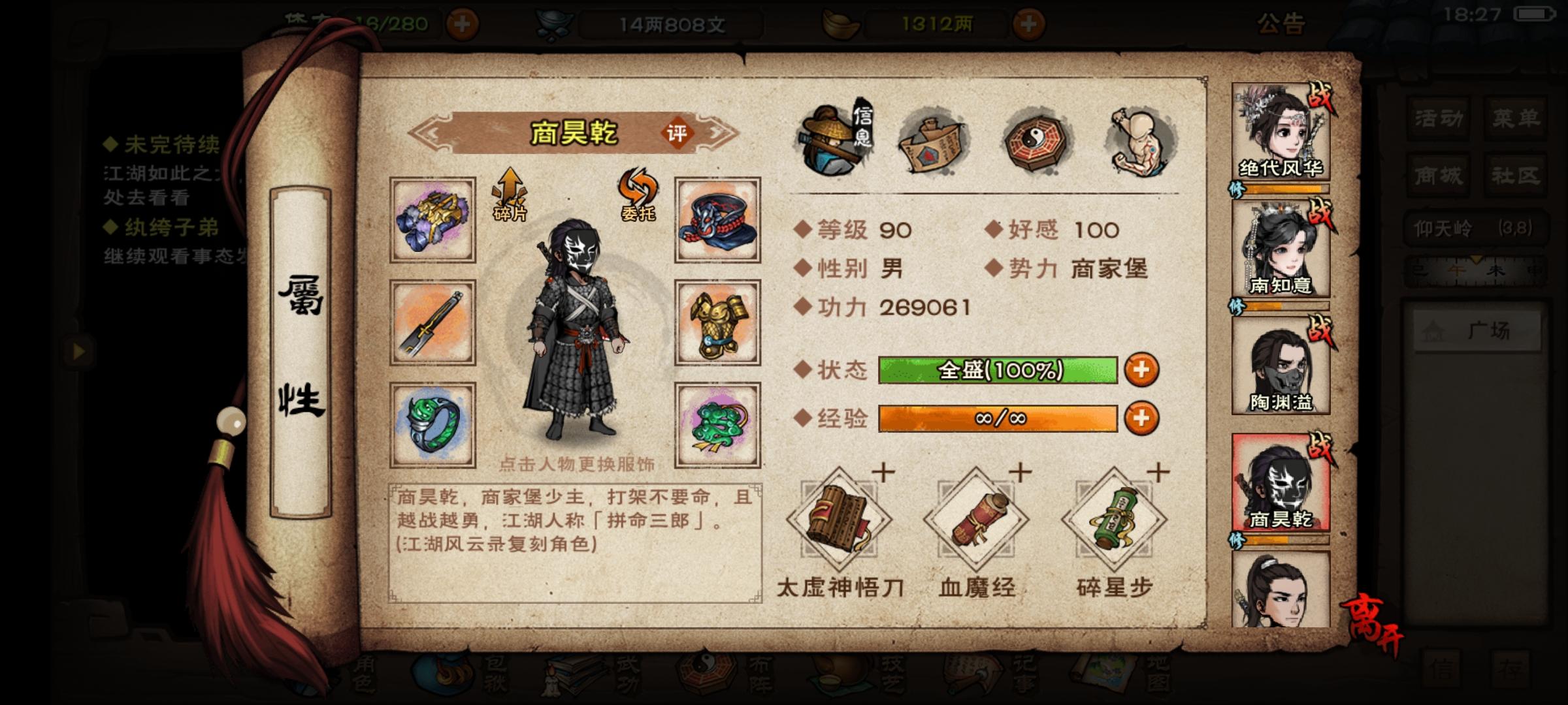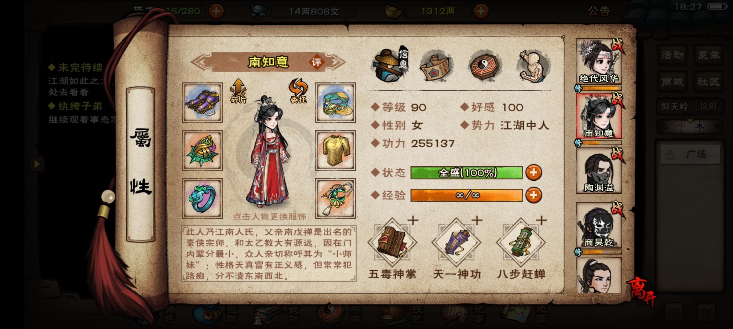 ,青蛾工具人增伤,韧性要高。(冷知识,韧性达到800以上开始有概率免控)青蛾工具人开出赴火那机关枪与八荒归元真的是嘎嘎乱杀!个人感觉套路武学用玄阴或无暇更好(但我这边这俩都没给到陶,懒得再传来传去)。我这个号是100w战力刚刚好,主商南练度还算不错,最近擂台也挺频繁耍的,以弱胜强(低战胜高战)是家常便饭,当然有时候也会让人血压高,但总体来说是很不错的![[表情_送花]](https://img.tapimg.com/market/images/68b3dc8473df915ad2b85da5efef4f56.png)