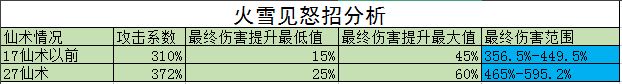 2.2.1怒招分析:火雪见的怒招是后排372%*攻击,附加25%-60%波动伤害提升,如果当对面血量30%以下的时候,必定取最高波动值。具体可以看下列数值分析表格:
