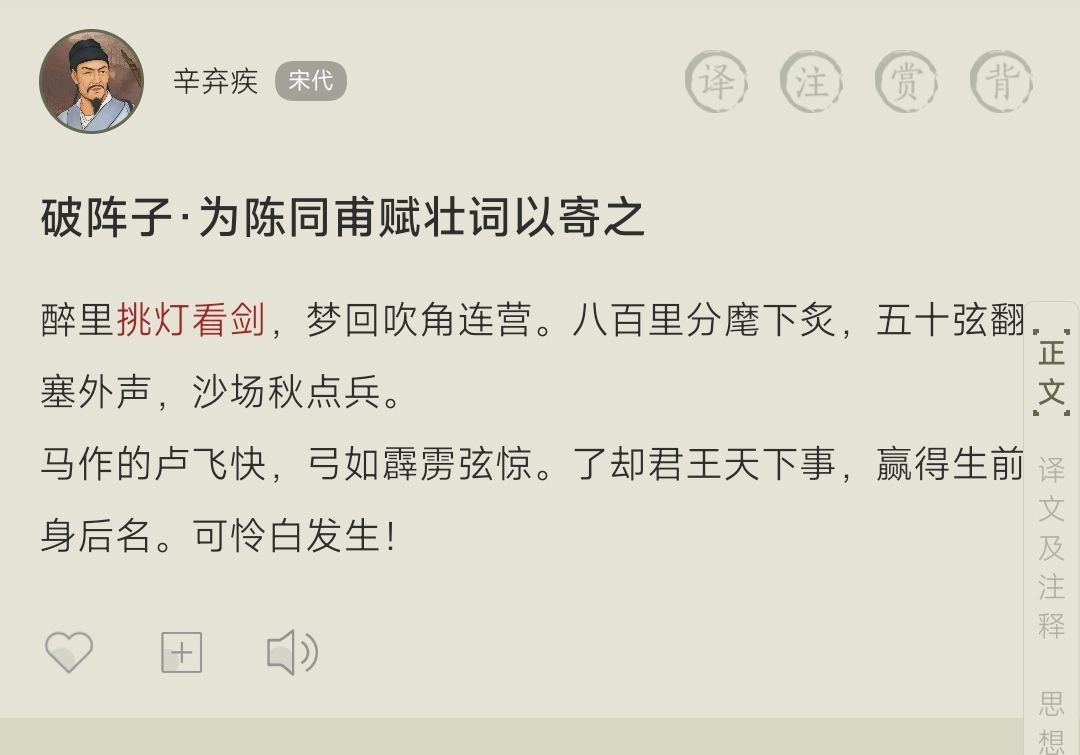 6.挑灯看剑:醉里挑灯看剑,梦回吹角连营。