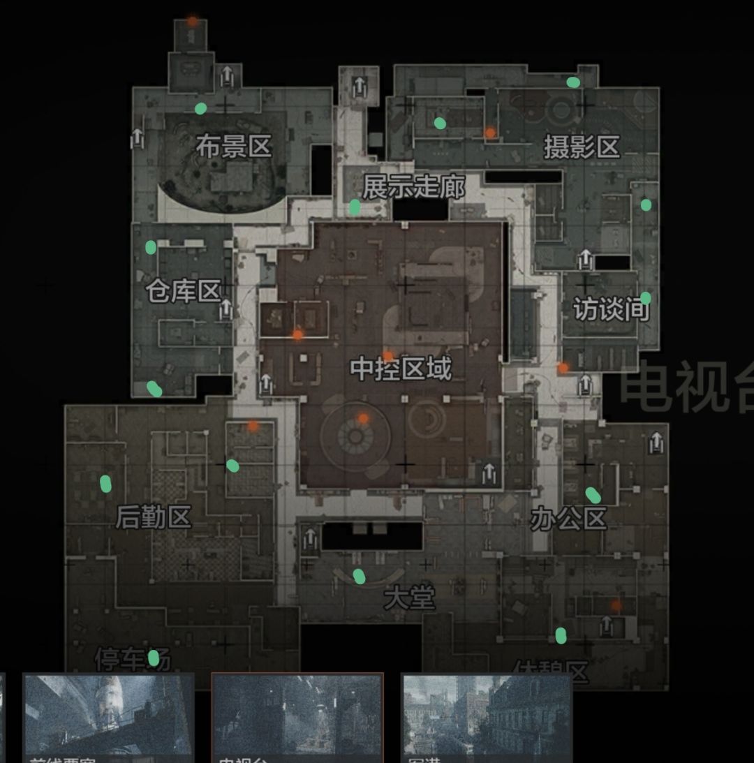(7)展示厅出生点,别想着上旋转楼梯了,路过布景出口会被布景区的架死。要么冲中控西门进中控拉闸摸免保,要么去服装室卷地皮,注意服装室大概率有人,也就是你一开门就能看见那种,如果没人,那就说明这队人刷二楼的录音室了,摄影区那边大概率有人。卷完摸摄影区免保,注意闪身排点,往访谈间走。注意访谈间过道,尤其是访谈间那个后门哪里,有个掩体,大概率有人,静步过去排完点再摸访谈间过道地皮。进访谈间继续卷,建议常配访谈间钥匙,遇到桌子上刷大金就能开,没刷自己看情况。然后走访谈间旁边的化妆室上二楼去录音室,清清人机扣子弹,这里走大厅撤离建议装人机步,大概率黄卡房有人在整理物资。