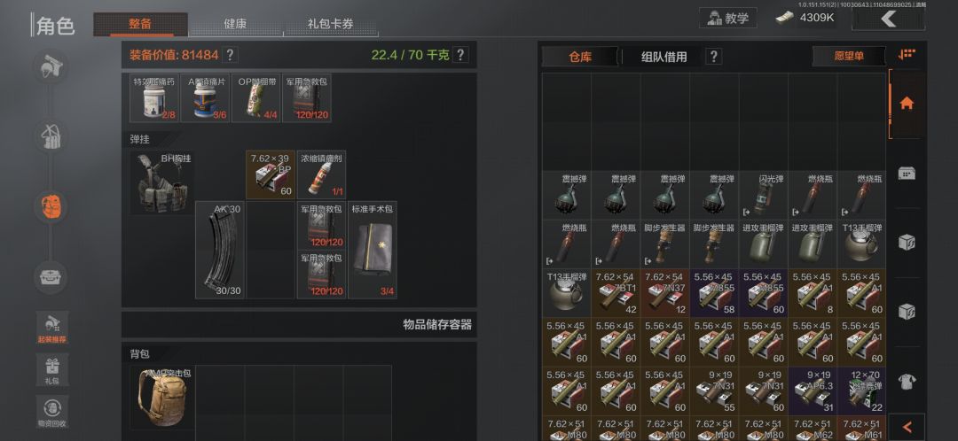 弹挂联络人的BH步兵胸挂,对局里换人机的926胸挂就行,至于消耗品都是对局捡,吃喝不用带,止疼和回复道具看上局情况捡漏别人就行,图里的我就是对局捡漏的所以杂的很。如果有剩一半耐久的大黑包(TMK医疗包),可以用926轻型弹挂。