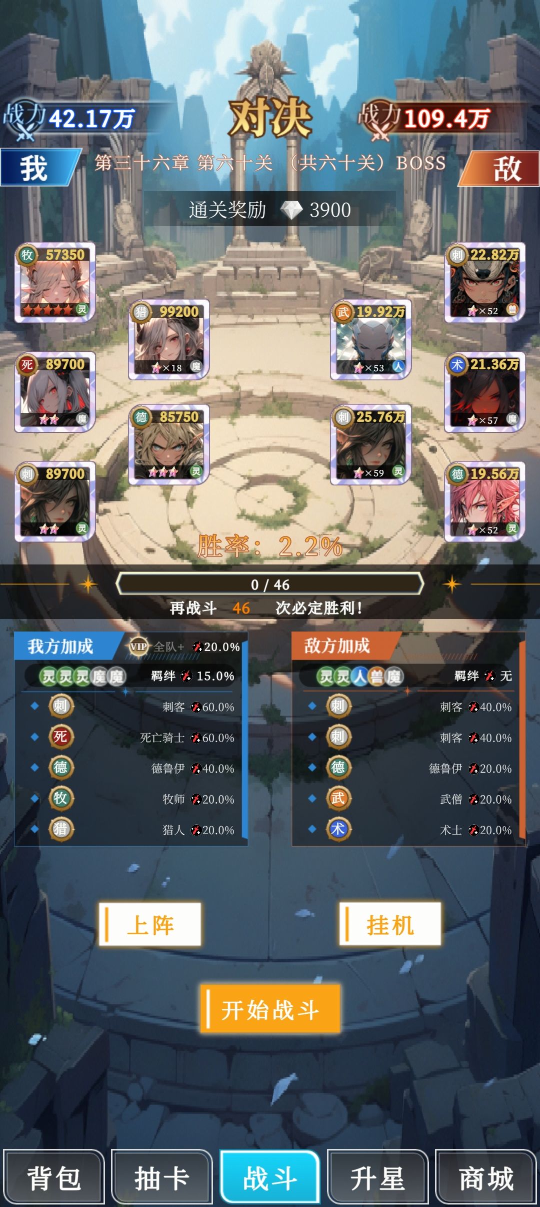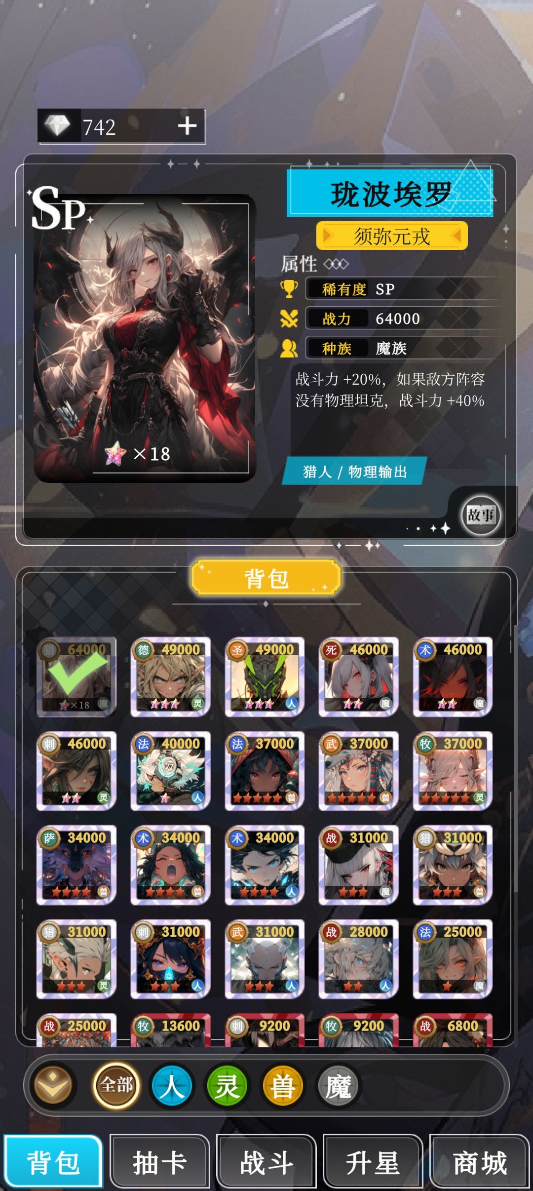 中期意外分解了不少狗粮拖了波节奏,外加后期没有怎么上心肝进度,战力有点没压住,最终最高单卡练度达到了18彩星(23同名),(可惜是个猎人,很多时候甚至不如少了5星的刺客好用)整体练度接近全图鉴白卡了。预计可以压战力到单卡最高1彩星左右(17同名),就能满足通关需求。