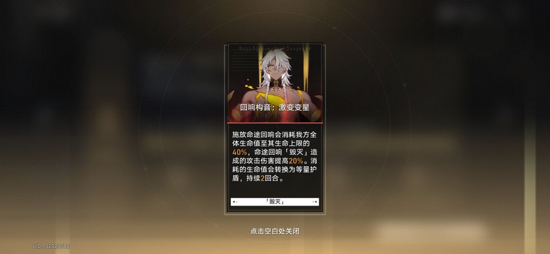 命途选择毁灭,毁灭祝福比较全能,适合没有练度的新人玩家。练度低时期,伤害和承伤来源于“毁灭回响”技能。