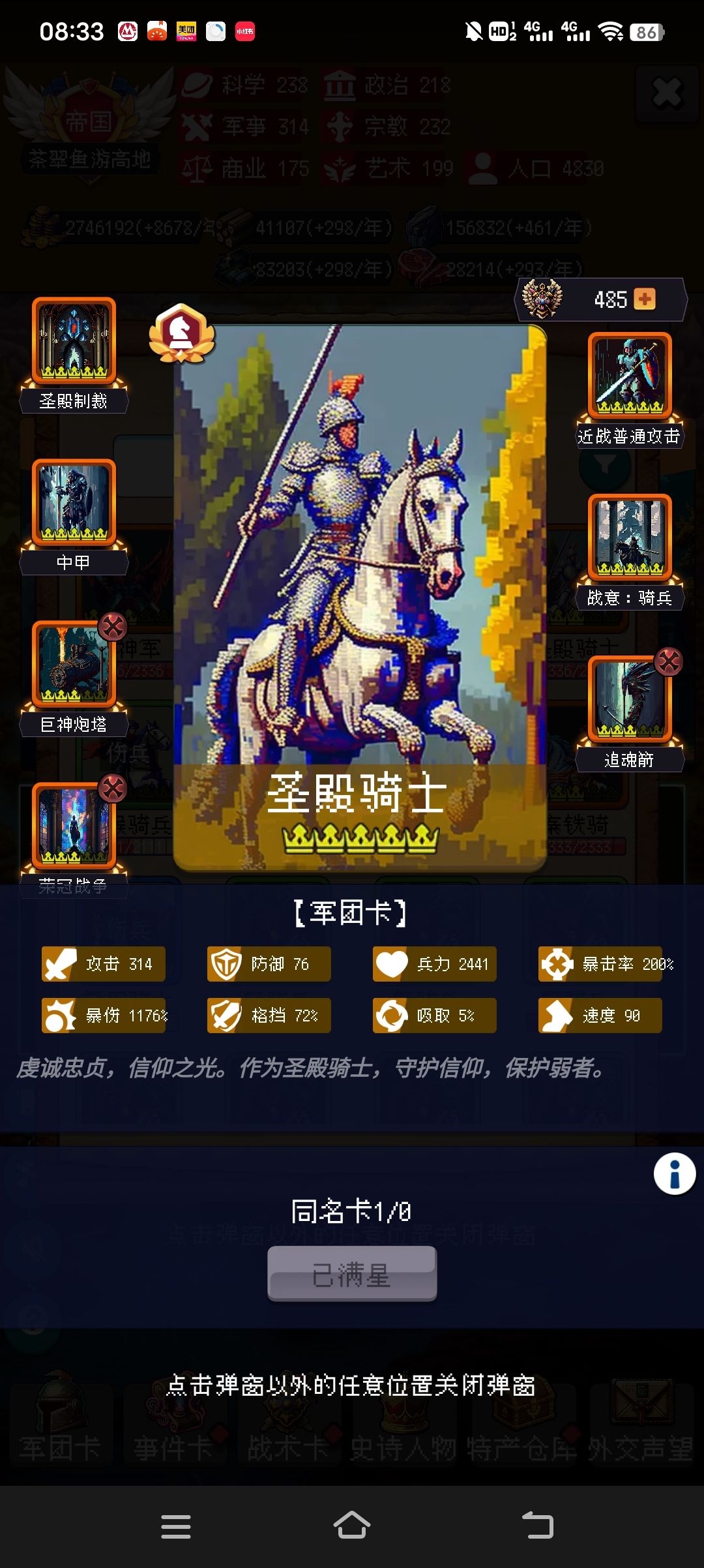 骑兵最重要的政策就俩,一个33-53年之间的军事传统(学院事件加爆伤),一个就是军功爵(战斗事件加攻击和暴击率)。