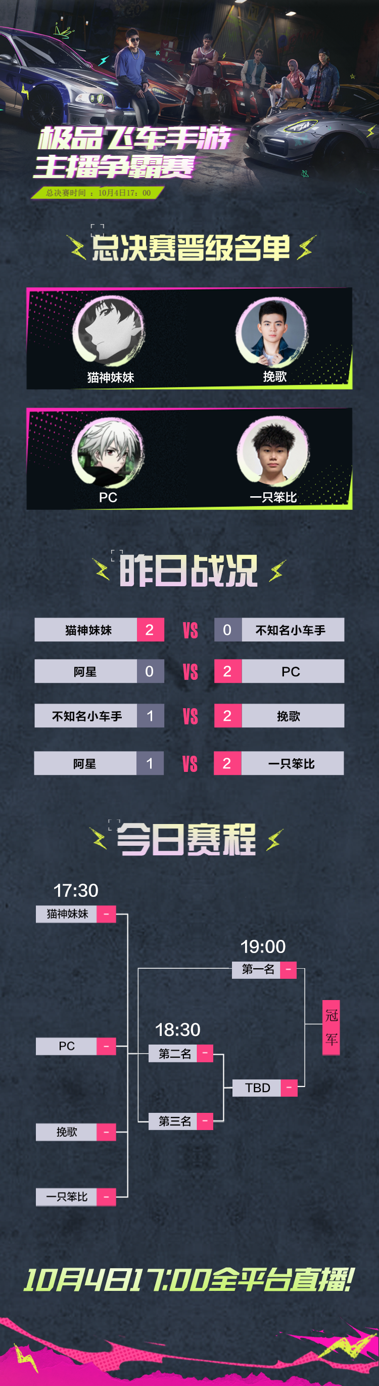 极品飞车手游主播争霸赛第二轮双败淘汰赛已于10月3日结束,4名选手冲出重围进入总决赛,冠军宝座已是近在咫尺,谁会是这街头赛场的“车神”呢!