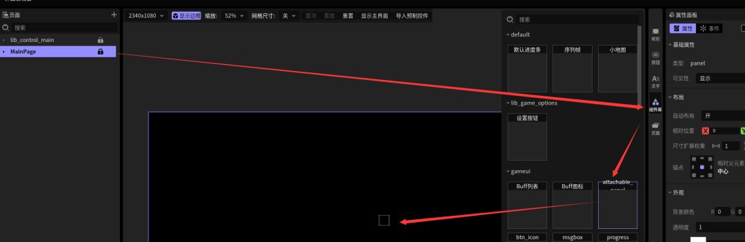 打开界面编辑器,创建一个附着面板组件到MainPage页面下。如图:
