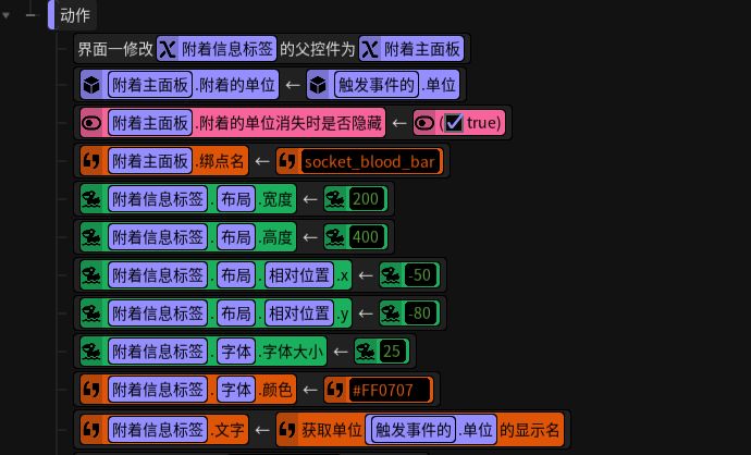 创建好变量后,在动作里面写出获取名字的语句,布局,名字显示的位置绑点信息等,具体如下图: