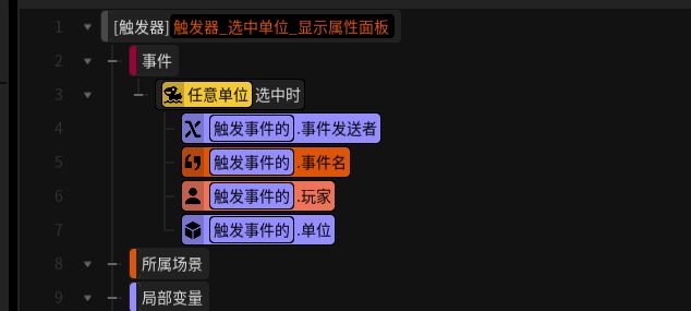 打开触发编辑器,创建一个触发显示名字的事件,我这里写在了选中单位事件里面。(可以根据自己游戏确定显示的时间)如图: