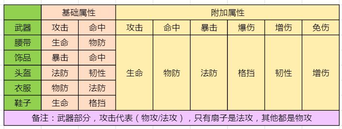 备注:表中的附加属性,表示该类型装备,只能随机生成表中所列的属性种类。
