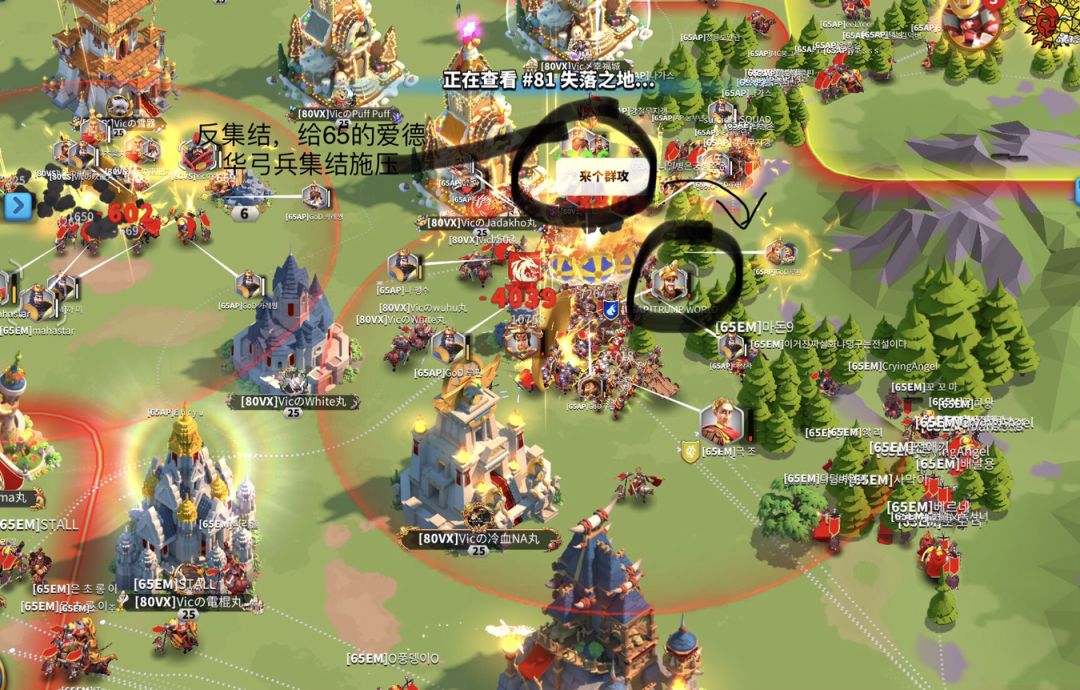 咱们要做的就是去增加优势,比如为集结队伍创造一个更好的输出空间。在集结部队抵达的前几分钟,尽量把建筑物周围的敌方部队往后推,防止己方集结部队被围殴或吃到debuff。同时也要小心对方驻防统帅是否带有aoe伤害,如李成桂和孙武等。这种情况下,如果你的部队被这个aoe打到的话,士兵是会当场去世的...哈哈哈