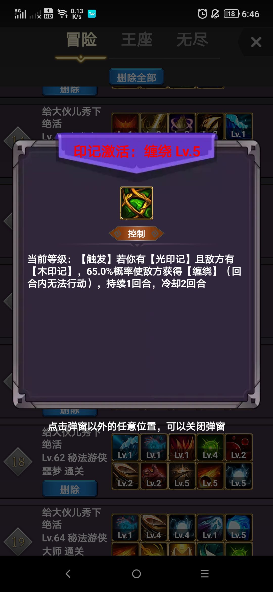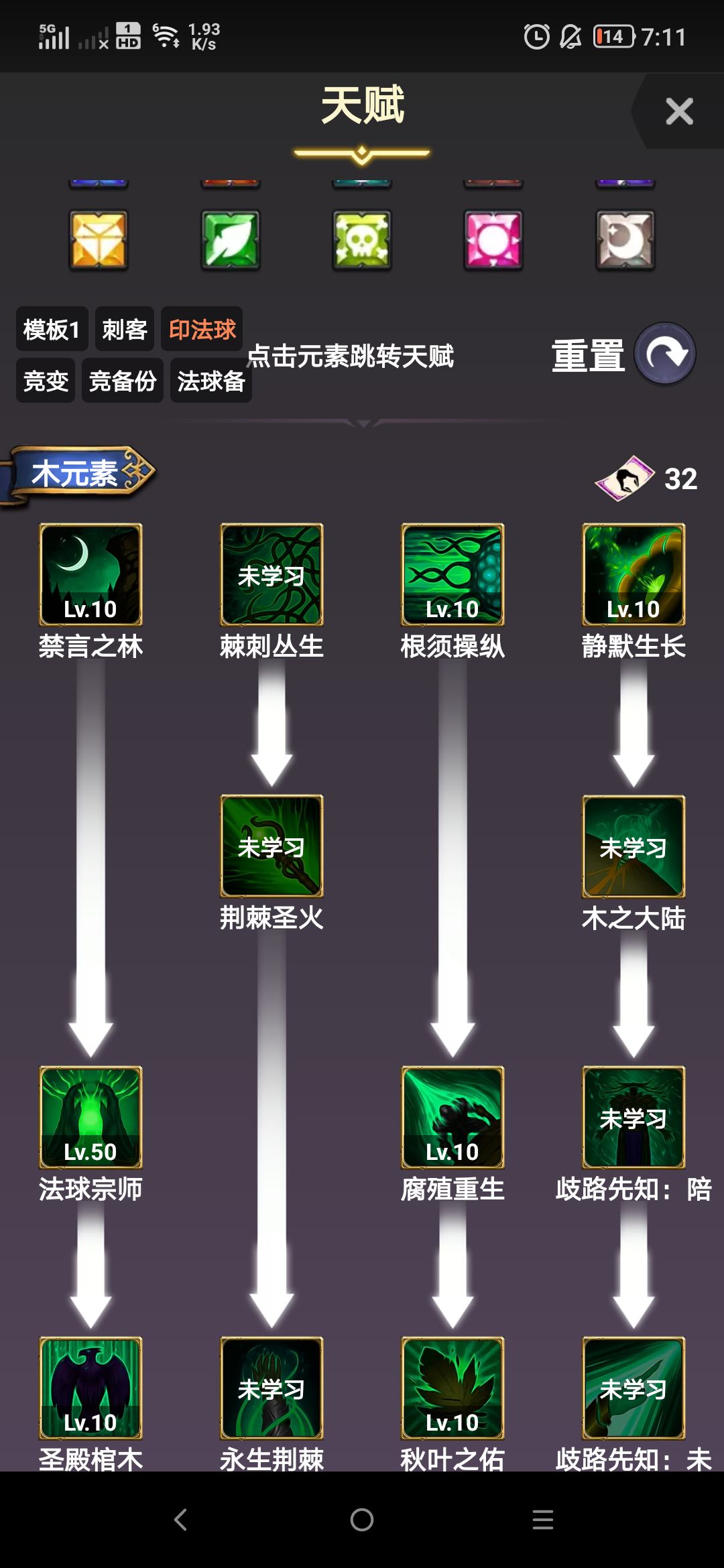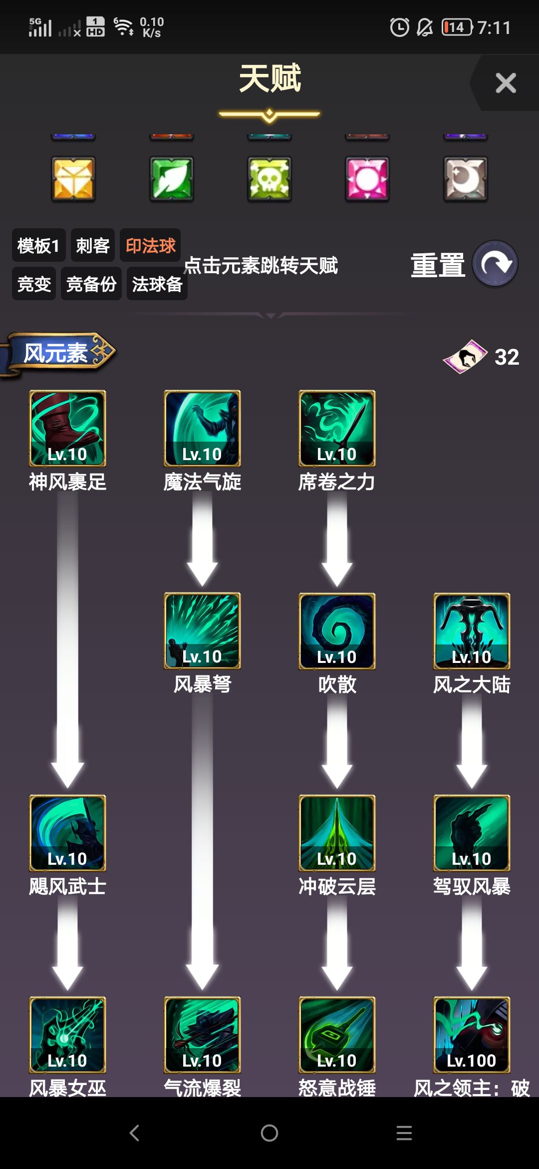 免死带一个,免控带一个,点一点就够,不过都没用上,以防万一。技能触发概率的也是必不可少的,尤其是天赋和遗物里面很多核心技能都是触发技能。怠速加炫光匕首回血比吸血靠谱多了,最强暴击buff热带低气压,风系变身的施法,除了高额的攻击力外还自带不和双重施法冲突的多次施法,非常暴力,在5回合以后什么怪都是秒。刚需的技能就这几个,可塑性非常强,这里再说一下为什么带石球,主要还是考虑到元素石,整个构筑土金完全用不到,水也只有一个极限光环用得到,用石球来消化用不到的元素石是不二之选。由于石球是局内合成技能里面唯一的输出,所有的附魔都可以丢给它