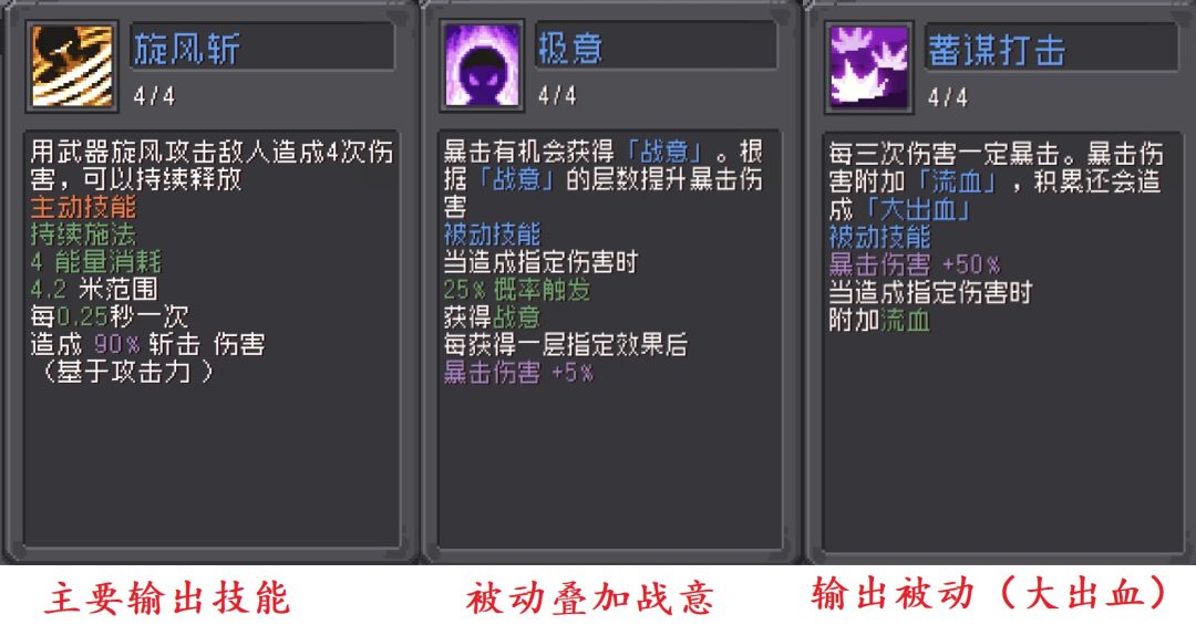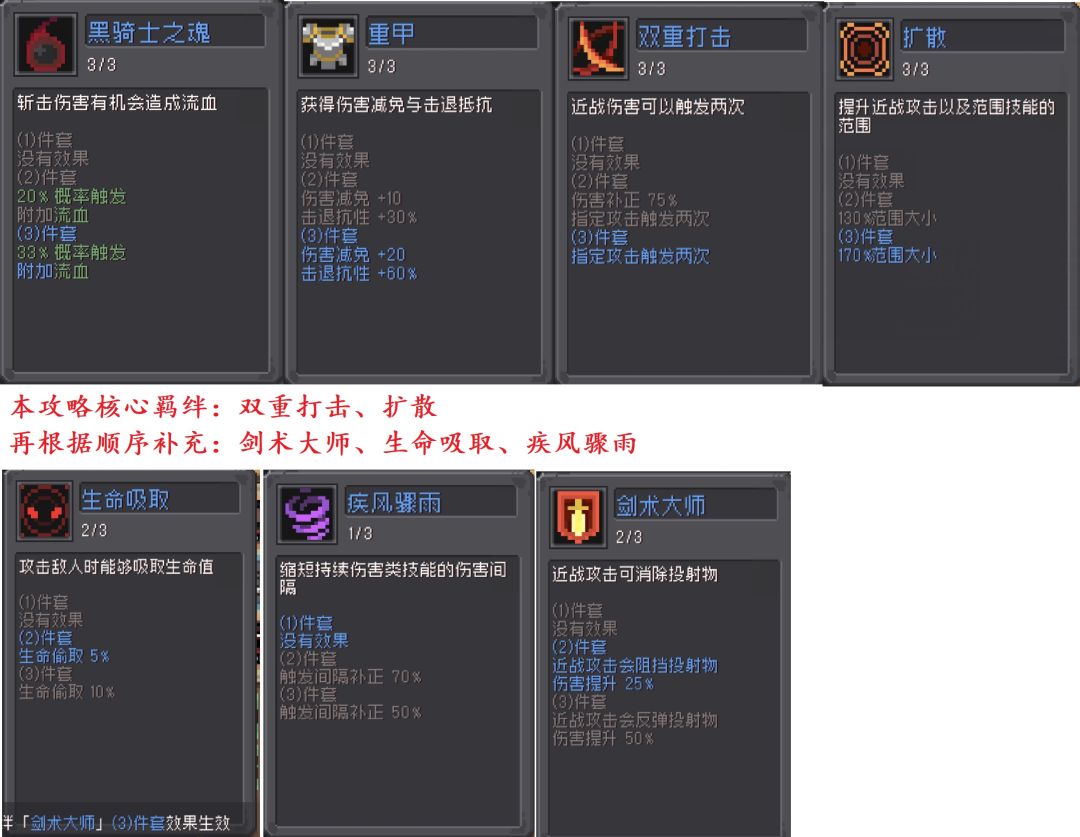 此BD羁绊大于词条,所有装备以羁绊为优先。主要提升打击频率从而触发大出血来提升输出,个人推荐优先2~3级双重打击、3级扩散、2级吸血;后续慢慢凑齐2~3级疾风骤雨。(剑术大师被削了,不能消除弹幕了)