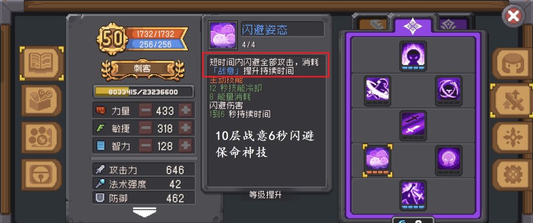 闪避姿态:消耗10层战意可获得6秒全闪避状态,保命神技;