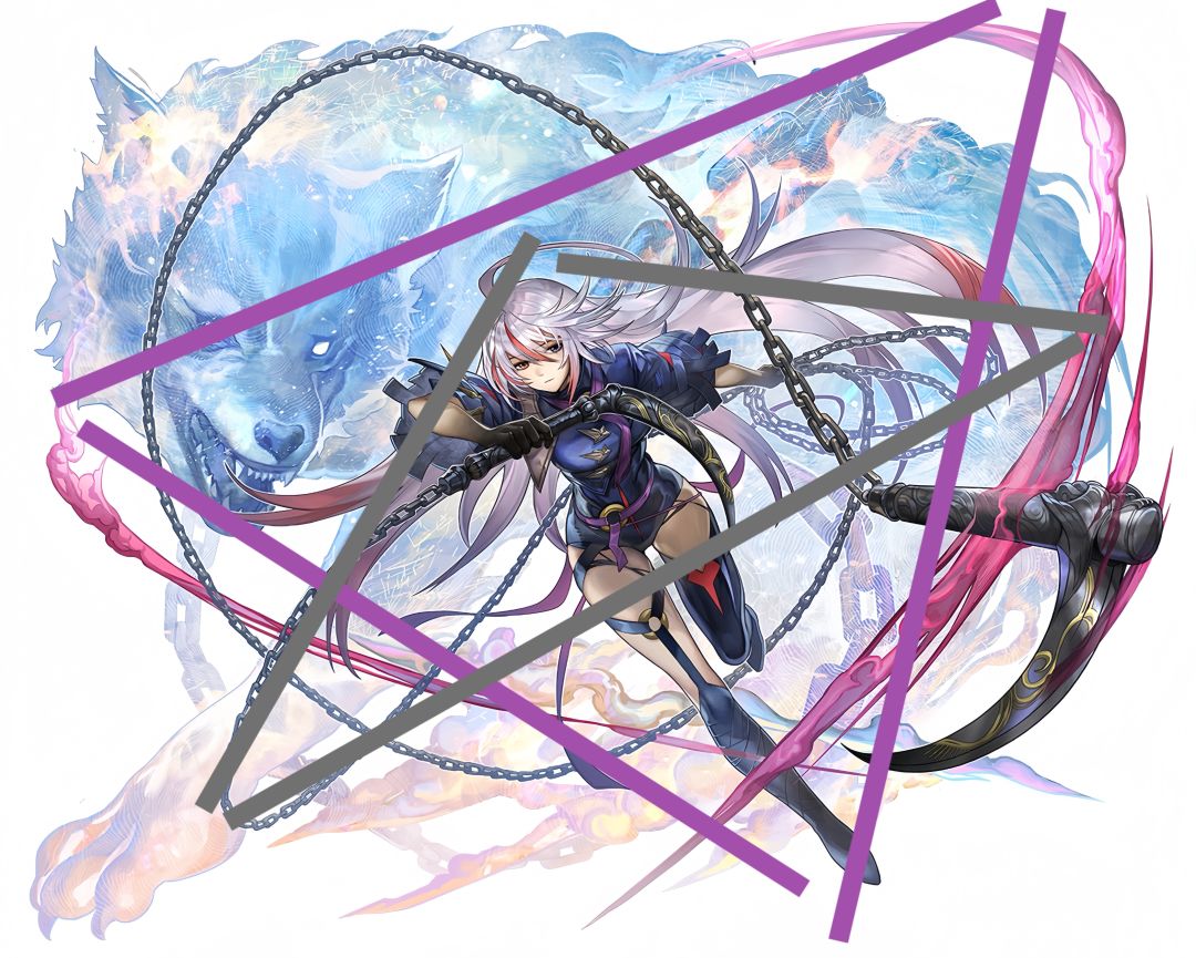 狼姐的头,左侧锁链和右侧头发与锁链组成了一个斜正三角(图中灰色);背景左侧与右侧较明显的紫色痕迹组成了斜倒三角。这是次构图,挑选了灰/紫色,很好地丰富了视觉观感,同时避免显得过于杂乱。