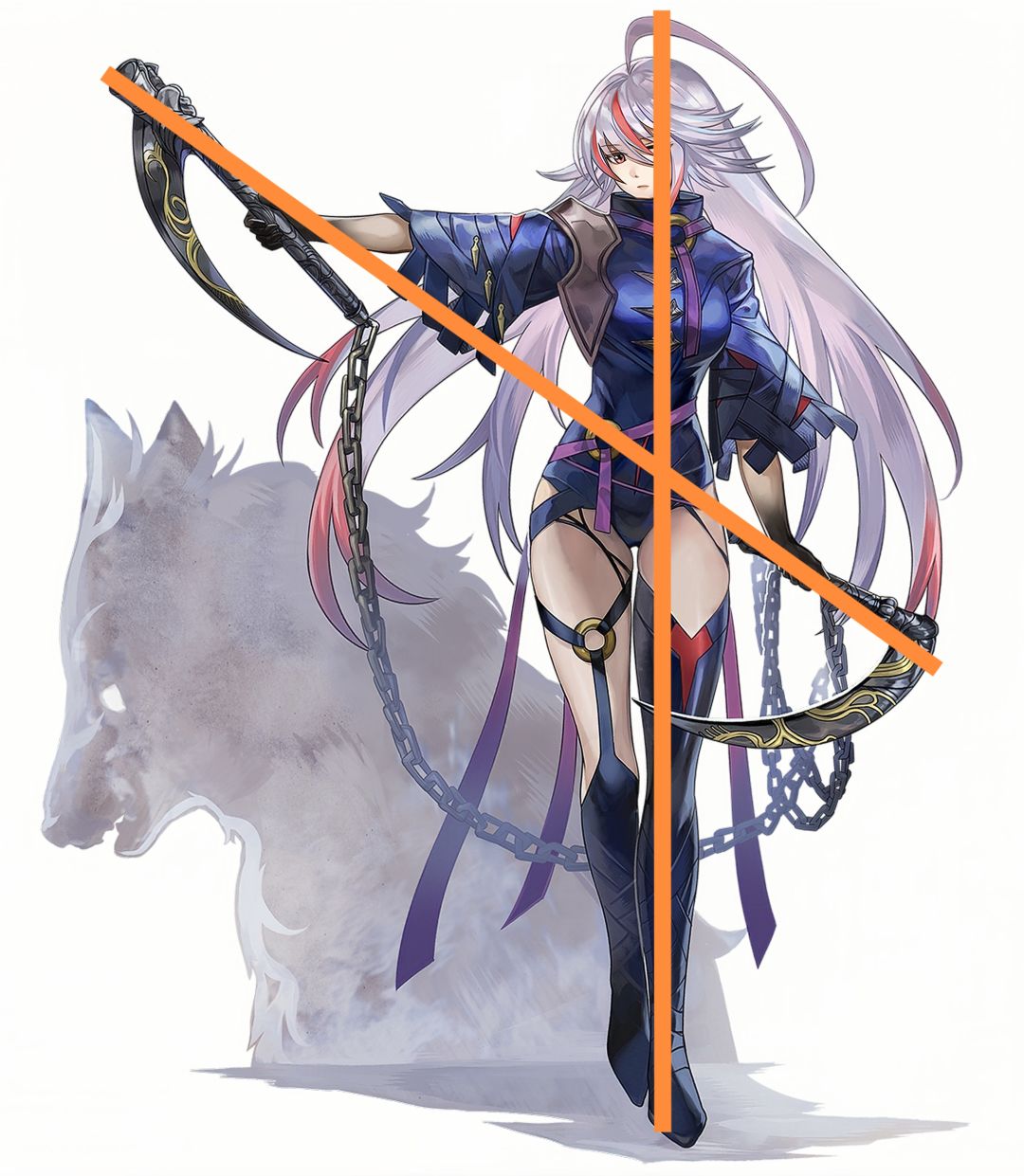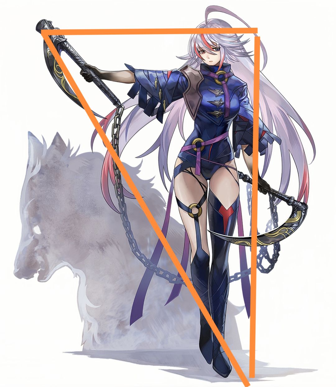 狼姐前冲的身形构成了一个略斜的倒三角(图中橙色);背景中的锁链最高处,狼的爪与右下的锁镰(可能找的不太准)组成了一个略斜的正三角(图中绿色)。这是主构图。